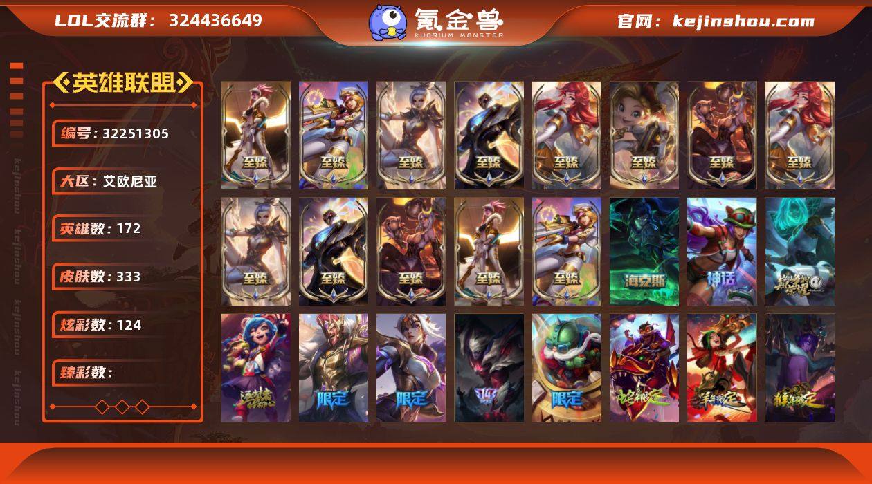 实名: 可修改 英雄数: 172 皮肤数: 333 炫彩数: 124 至臻: 至臻 未来战士 锤石,至臻 烈焰美人 薇恩,至臻 玉剑传说 武剑仙,至臻 电玩女神 凯特琳,至臻 战斗学院 拉克丝,至臻 K/DA 阿卡丽,至臻 奥术师 佐伊,至臻 电玩女神 凯特琳(2022),至臻 K/DA 阿卡丽(2022),至臻 烈焰美人 薇恩(2022),至臻 未来战士 锤石(2022),至臻 玉剑传说 武剑仙(2022),至臻 战斗学院 拉克丝(2022) 海克斯: 摄魂 薇恩 限定: 舞会公主 安妮,2021 全球总决赛 嘉文四世 赛季限定皮: 胜利枪神 格雷福斯,胜利女神 奥莉安娜,胜利枪神 卢锡安,胜利女神 瑟庄妮,胜利凤凰 艾尼维亚,胜利之王 泰达米尔,胜利巨口 克格莫,胜利女神 娑娜,胜利剑圣 易,胜利之运 崔斯特,胜利女神-菲奥娜,胜利行刑官 德莱文 冠军限定系列: S1FNC 酒桶,S1FNC 迦娜,S2 暗杀星 努努,S2 暗杀星 慎,S3 SKT T1 劫,S3 SKT T1 贾克斯,S3 SKT T1 李青,S13 T1 李青 冰雪节限定: 胡桃夹子 萨科,平安夜女神 娑娜,圣诞开心鬼 提莫,圣诞精灵 崔丝塔娜,圣诞狂欢 基兰,圣诞老人 古拉加斯,圣诞糖果棒 厄运小姐,圣诞驯鹿 克格莫,喜庆之树 茂凯,邪恶圣诞老人 维迦,雪默丁格,英勇玩具兵 普朗克,狂心冰王 图奇 泳池派对: 泳池派对 菲奥娜,泳池派对 雷克顿,泳池派对 李青 万圣节限定: 鬼影森森 茂凯,魅惑女巫 奈德丽,南瓜头 费德提克,无头骑士 赫卡里姆 年限: 烈焰美人 薇恩,张辽 文远,神龙之翼 库奇,神龙烈焰 金克丝,紫金罗刹 莫甘娜 周年: 2周年 德莱厄斯,4周年 锐雯,10周年 安妮 其他限定/神话皮: 源代码 乐芙兰,防暴天使 凯尔,波比的巧克力工坊,防暴士兵 辛吉德,钢铁之翼 艾尼维亚,冠军典狱长 锤石,冠军掠夺者 卡兹克,冠军之刃 锐雯,冠军之刃 锐雯 2016,警用试作体K-9 内瑟斯,蒙多蒙多,密林猎手 提莫,野兽猎人 德莱文,野兽猎人 泰达米尔,征服者 卡尔玛,外星装甲 库奇,十五周年纪念 希维尔,暗裔英...
