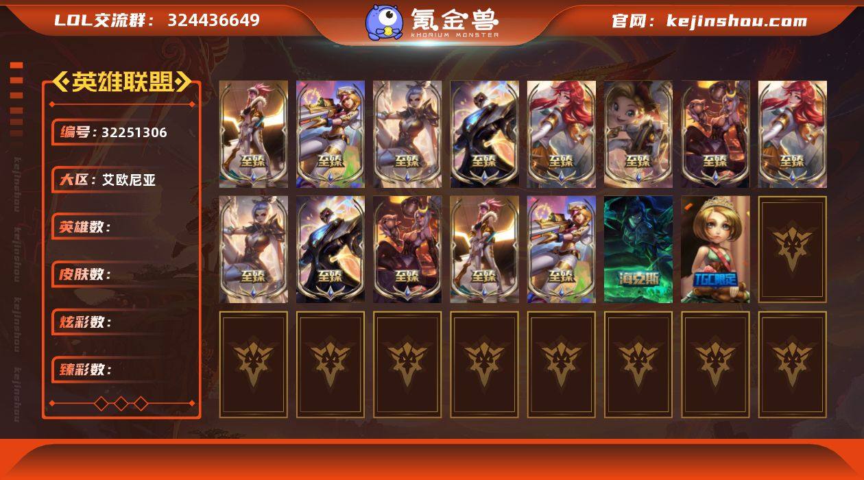 实名: 不可修改 英雄数: 172 皮肤数: 1024 炫彩数: 380 至臻: 至臻 星之守护者 妮寇,至臻 飞升战神 潘森,至臻 真实伤害 亚索,至臻 月蚀骑士 赛娜,至臻 西部魔影 泰隆,至臻 至高天 奎桑提,至臻 墨之影武者 亚索,至臻 心之钢 永恩,至臻 DRX 亚托克斯,至臻 黑色玫瑰假面舞会 卡特琳娜,至臻 战斗学院 奇亚娜 海克斯: 海克斯 嘉文四世,摄魂 薇恩,海克斯 安妮,海克斯 崔丝塔娜 限定: 庆典女皇 艾尼维亚 情人节限定: 觅心萝莉 金克丝,觅心魔灵 奥利安娜,觅心女王 艾希,甜心宝贝 安妮,甜心之羽 霞,幽梦玫瑰 泰隆,水晶玫瑰 迦娜,黯然心伤 阿木木 赛季限定皮: 胜利女神 希维尔,胜利之树 茂凯,胜利枪神 格雷福斯,胜利女神 奥莉安娜,胜利之剑 亚托克斯,胜利枪神 卢锡安,胜利女神 瑟庄妮,胜利凤凰 艾尼维亚,胜利之王 泰达米尔,胜利巨口 克格莫,胜利女神 娑娜,胜利剑圣 易 冠军限定系列: S1FNC 酒桶,S1FNC 迦娜,S1FNC 嘉文四世,S1FNC 卡尔萨斯,S1FNC 库奇,S2 暗杀星 发条,S2 暗杀星 蒙多,S2 暗杀星 努努,S2 暗杀星 慎,S2 暗杀星 伊泽瑞尔,S3 SKT T1 劫,S3 SKT T1 贾克斯,S3 SKT T1 薇恩,S3 SKT T1 李青,S3 SKT T1 婕拉,S4 SSW 锤石,S4 SSW 雷恩加尔,S4 SSW 泰隆,S4 SSW 图奇,S4 SSW 炼金,S5 SKT T1 雷克顿,S5 SKT T1 阿利斯塔,S5 SKT T1 阿兹尔,S5 SKT T1 蜘蛛,S6 SKT T1 烬,S6 SKT T1 球女,S8 IG 卡莎,S10 DWG 蕾欧娜,S5 SKT T1 滑板鞋,S11 EDG 厄斐琉斯,S12 DRX 阿卡丽,S12 DRX 凯特琳 冰雪节限定: 阿木木:“主人不要我了”,冰雪节 格雷福斯,冰雪节 玛尔扎哈,冰雪节 辛吉德,冰雪兽 纳尔,冬季仙境 发条,冬季仙境 卡尔玛,寒冬精灵 璐璐,胡桃夹子 萨科,平安夜女神 娑娜,魄罗骑士 瑟庄妮,圣诞捣蛋鬼 金克丝,圣诞开心鬼 提莫,圣诞精灵 崔丝塔娜,圣诞狂欢 基兰,圣诞狂欢 努努和威朗普,圣诞老人 布隆,圣诞老人 古拉加斯,圣诞糖果棒 厄...