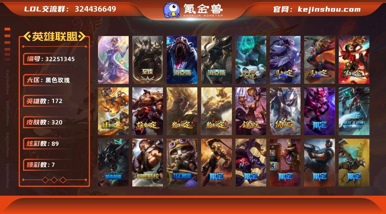 t37278【黑色玫瑰】 320皮肤 89炫彩 7臻彩 6神话/55限定/35传说/172英雄 账号等级:322 【重要头像】沐浴震惊 【重要皮肤】腥红之月亚托克斯至臻 海克斯科技雷克顿 零之枪骑赫卡里姆 胜利行刑官德莱文 荣誉使者玛尔扎哈 电玩勇者锐雯 天龙之子斯莫德 替父从军花木兰 神龙烈焰金克丝 北辰之威内瑟斯 南天之怒沃里克 美猴王孙悟空 广寒仙子嫦娥 张辽文远 烈焰美人薇恩 胜利之树茂凯 胜利机器人布里茨 胜利女神奥莉安娜 胜利枪神格雷福斯 胜利枪神卢锡安 胜利之剑亚托克斯 觅心女王艾希 觅心之翼奎因 魄罗骑士瑟庄妮 平安夜女神娑娜 死亡誓约劫 泳池派对厄运小姐 泳池派对格雷福斯 泳池派对李青 SSG嘉文四世 SSW锤石 SKTT1劫 SKTT1薇恩 暗杀星蒙多 Fnatic迦娜 Fnatic古拉加斯 防暴士兵格雷福斯 防暴士兵辛吉德 防暴天使凯尔 钢铁之翼艾尼维亚 冠军掠夺者卡兹克 冠军之隐劫 鬼影森森茂凯 鬼影重重魔腾 警用试作体K9内瑟斯 密林猎手提莫 圣诞开心鬼提莫 圣诞狂欢努努和威朗普 雪默丁格 野兽猎人德莱文 英勇玩具兵普朗克 勇者阿狸 暗影沃里克 阿木木主人不要我了 地底世界崔斯特 都铎王朝图奇 十周年纪念安妮 源代码乐芙兰 神凰行者瑞羽圣凰艾尼维亚 机神苍狼瑟提 暗裔英雄盖伦 大元素使拉克丝 【传说皮肤】律政大亨蒙多 神龙尊者昼日真龙亚索 星之守护者拉克丝 金牌主播德莱文 神龙尊者圣龙李青 灵魂莲华阿狸 屠龙勇士潘森 炼狱魔犬内瑟斯 上古战魂魔腾 第三类接触黑默丁格 泳池派对吉格斯 蔷薇绅士杰斯 神王德莱厄斯 死亡骑士盖伦 黯黑魔龙希瓦娜 天煞劫 血石领主弗拉基米尔 西部魔影卢锡安 地狱之门卫士加里奥 宇航员诺提勒斯 黎明使者锐雯 霸天异形卡兹克 苍穹之光韦鲁斯 驯龙炮手崔丝塔娜 枯萎之壤泽拉斯 陆地王者4WD布...