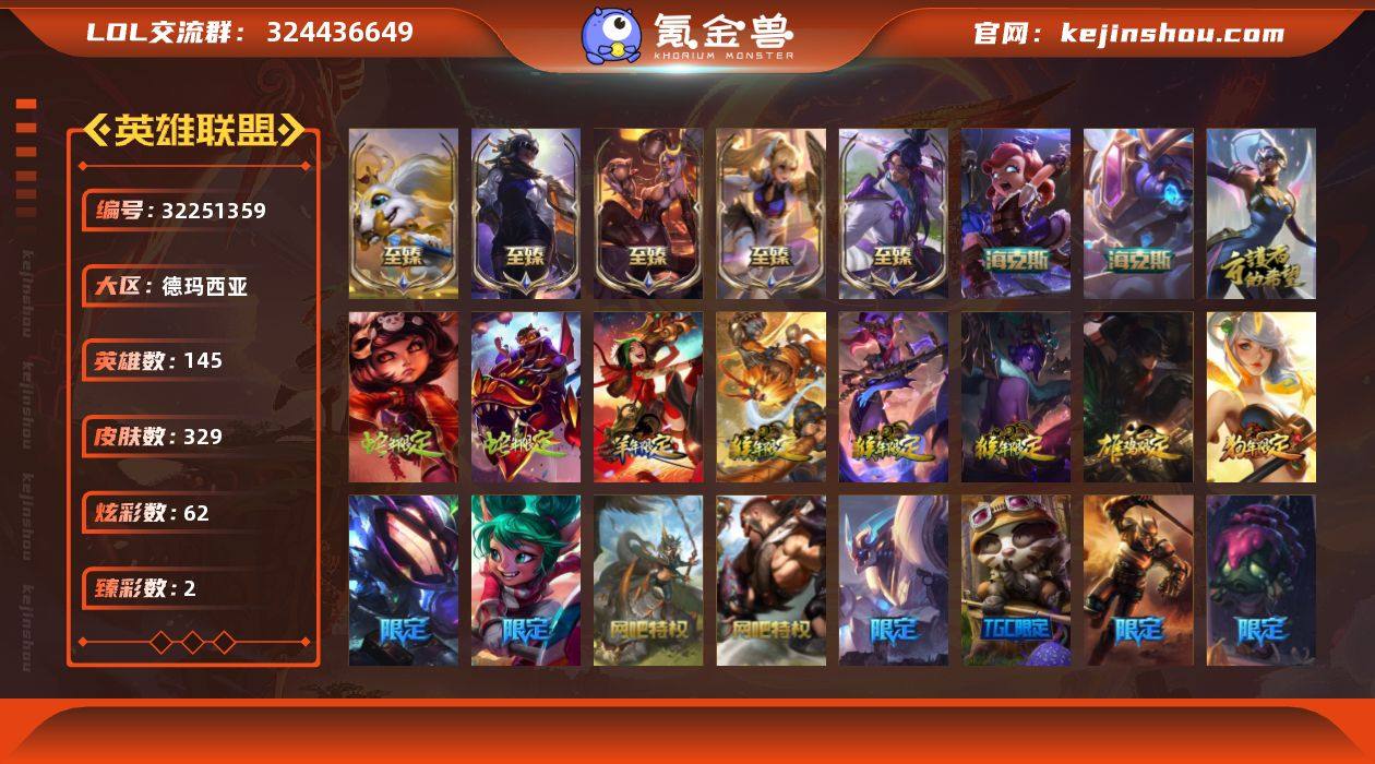 t37296【德玛西亚】329皮肤 62炫彩 2臻彩 8神话/52限定/25传说/145英雄 账号等级:213 【重要头像】星守阿狸 福牛守护者厄斐琉斯 至臻战斗学院蕾欧娜 【重要皮肤】灵魂莲华易至臻 战斗学院蕾欧娜至臻 真实伤害赛娜至臻 烈焰美人薇恩至臻 绒毛菲兹至臻 海克斯科技安妮 海克斯科技克格莫 黎明使者卡尔玛 创星之灵璐璐 荣誉使者玛尔扎哈 养蜂人辛吉德 玉剑传说舞剑仙 银龙裁决泰隆 神龙烈焰金克丝 春晖神女拉克丝 你看见过我的熊猫吗安妮 美猴王孙悟空 定海神珍孙悟空 玉净夜叉凯特琳 紫金罗刹莫甘娜 虎痴之拳蔚 醒狮克格莫 神龙之翼库奇 胜利女神瑟庄妮 圣诞老人德莱文 大魔法锅布里茨 灵魂收割者索拉卡 泳池派对普朗克 泳池派对雷克顿 鸡里奥 SKTT1扎克 SKTT1艾克 SKTT1薇恩 暗杀星奥莉安娜 暗杀星慎 Fnatic迦娜 Fnatic库奇 Fnatic嘉文四世 Fnatic卡尔萨斯 冰雪节玛尔扎哈 冰雪节辛吉德 鬼影重重魔腾 惊悚派对阿木木 警用试作体K9内瑟斯 密林猎手提莫 南瓜头费德提克 破空枪骑孙悟空 圣诞开心鬼提莫 圣诞狂欢基兰 圣诞狂欢努努和威朗普 圣诞老人古拉加斯 圣诞驯鹿克格莫 无头骑士赫卡里姆 喜庆之树茂凯 幸福女神乐芙兰 雪默丁格 野兽猎人德莱文 野兽猎人瑟庄妮 战场BOSS吉格斯 阿木木主人不要我了 波比的巧克力工坊 绝息圣堂洛 【传说皮肤】花仙女王卡尔玛 冰川巨兽墨菲特 合金巨兽努努和威朗普 恶魔之刃泰达米尔 约德尔国队长提莫 红色男爵库奇 大天使长米迦勒凯尔 律政大亨蒙多 泳池派对吉格斯 黎明使者锐雯 双重冰晶艾尼维亚 星之守护者阿狸 金牌主播德莱文 鬼魂新娘莫甘娜 电玩女神娑娜 提莫约德尔人的一大步 霸天异形卡兹克 战场女武神凯尔 魔幻卡牌崔斯特 腥红之月鬼武姬阿卡丽 女皇艾希 枯萎之壤泽拉斯 驯龙学者黑...