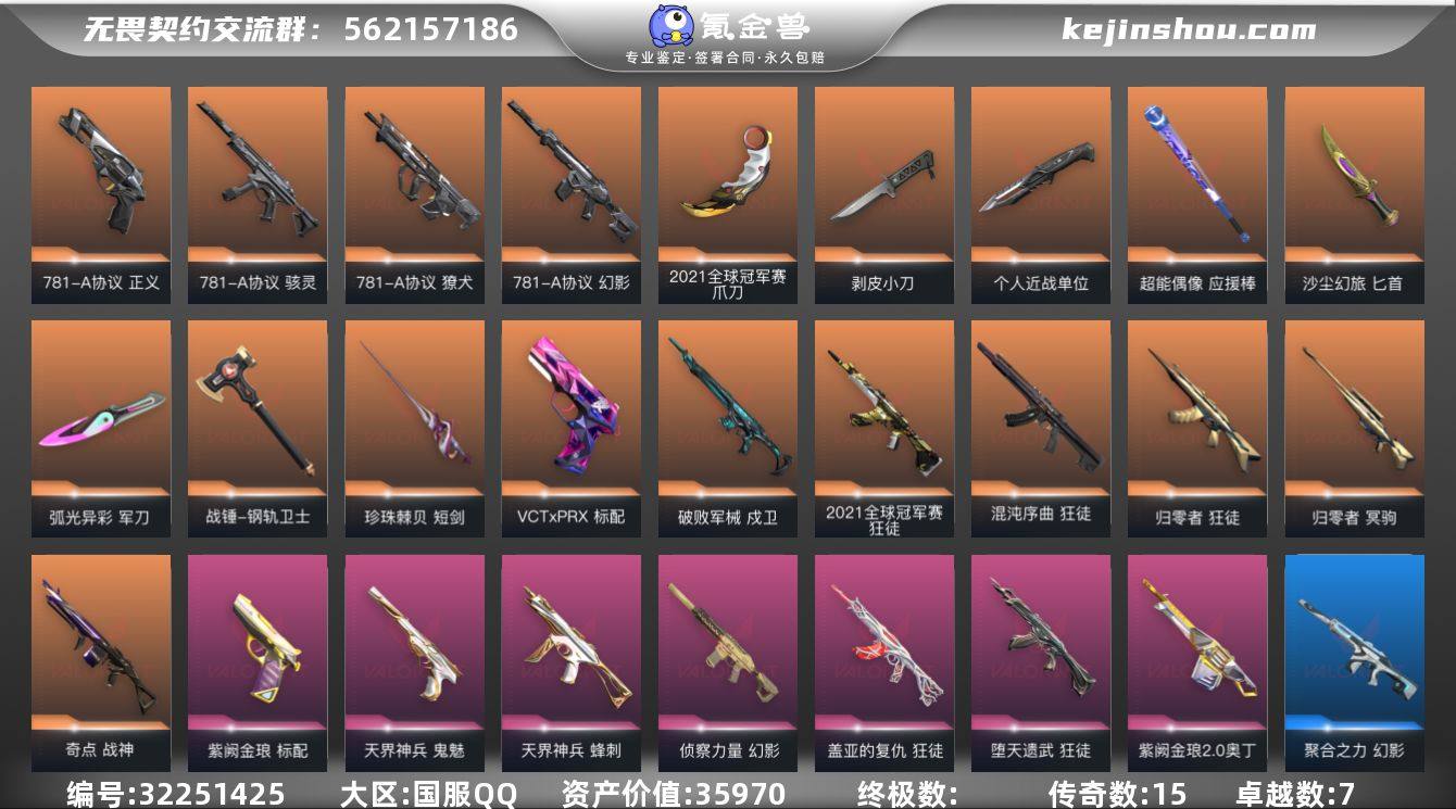皮肤资产价值:35970 已用源晶点数:930 剥皮小刀-异形猎人,匕首-沙尘幻旅,军刀-弧光异彩 爪刀-2021全球冠军赛 短剑-珍珠棘贝 个人近战单位-781-A协议 超能偶像 应援棒,战锤-钢轨卫士 獠犬-781-A协议,戍卫-破败军械,幻影-781-A协议,狂徒-2021全球冠军赛,狂徒-混沌序曲,狂徒-归零者,幻影-侦察力量,狂徒-盖亚的复仇,狂徒-堕天遗武,幻影-聚合之力,幻影-噬源兽防卫工程,幻影-战术小伙伴,幻影-珍珠棘贝,狂徒-超能偶像,狂徒-钢轨卫士,狂徒-弧光异彩,狂徒-沙尘幻旅,獠犬-采蜜小蜂队,獠犬-复古浪潮,獠犬-弧光异彩,獠犬-胡桃狂想,獠犬-战术小伙伴,戍卫-彩梦之城,戍卫-超能偶像,戍卫-钢轨卫士,戍卫-萌彩剪影,戍卫-珍珠棘贝 骇灵-781-A协议,蜂刺-天界神兵,蜂刺-聚合之力,蜂刺-战术小伙伴,蜂刺-胡桃狂想,蜂刺-深海水族,骇灵-光导纤维,骇灵-沙尘幻旅,骇灵-信手涂鸦,骇灵-珍珠棘贝 战神-奇点,奥丁-紫阙金琅2.0,奥丁-信手涂鸦,奥丁-战术小伙伴,战神-采蜜小蜂队,战神-萌彩剪影,战神-深海水族 冥驹-归零者,飞将-光导纤维,飞将-聚合之力,飞将-沙尘幻旅,飞将-信手涂鸦,冥驹-复古浪潮,冥驹-胡桃狂想,莽侠-深海水族 正义-781-A协议,标配-VCTxPRX,标配-紫阙金琅,鬼魅-天界神兵,标配-超能偶像,标配-光导纤维,短炮-钢轨卫士,短炮-弧光异彩,短炮-深海水族,鬼魅-采蜜小蜂队,鬼魅-光导纤维,鬼魅-胡桃狂想,狂怒-钢轨卫士,狂怒-聚合之力,狂怒-萌彩剪影,狂怒-珍珠棘贝,正义-复古浪潮,正义-纳米打击,正义-沙尘幻旅 判官-采蜜小蜂队,判官-超能偶像,判官-萌彩剪影,雄鹿-彩梦之城,雄鹿-复古浪潮 781-A协议卡面,采蜜小峰队卡面,超能偶像卡面,复活专家卡面,无畏契约GO!第一卷:零卡面,无畏契约GO!第一卷:奇乐卡面,无畏契约GO!第一卷:芮娜卡面,钢锁工牌卡面,归乡蝰蛇卡面,红鳞松叶卡面,虹吸式咖啡壶卡面,聚合之力卡面,梦幻奶茶卡面,情人节不死鸟卡面,热舞环节卡面,势不可挡盖可卡面,势不可挡KO卡面,双城之战金克丝卡面,双城之战拥抱卡面,失而复得卡面,声感陷阱设计图卡面,生意人麦宝卡面,铁之华卡面,VCTCN首冠卡面,VCTxPRX卡面,我眼中的世界卡面,艺无止境火焰卡面,艺无止境坚不可摧卡面,艺无止境灵感卡面,最高舞台卡面,战术小伙伴的夏日卡面,终章:生意人麦宝卡面 卖家说:出号21冠军全套全卡面有侦查金角生辉挂饰游戏国服开服号掌瓦内测号编号开头0000号上还有86点券和120R点没用