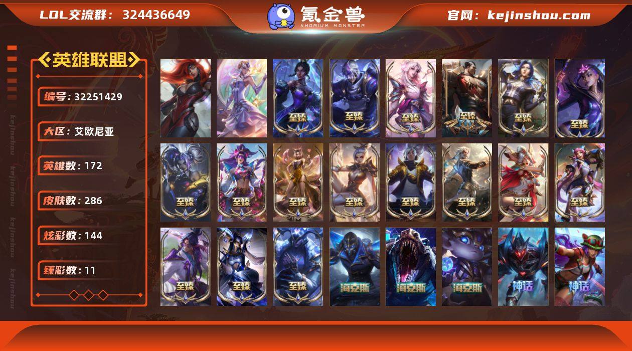 t37318【艾欧尼亚】 286皮肤 144炫彩 11臻彩 24神话/48限定/38传说/172英雄 账号等级:195 【重要头像】觅心之翼奎因 永恒之森霞炫彩 塞巴斯蒂安 灵魂莲华辛德拉炫彩 女帝卡特琳娜炫彩 【重要皮肤】北极星神梅尔至臻 灵魂莲华劫至臻 灵魂莲华拉克丝至臻 凯旋将军德莱厄斯至臻 双城之战2指挥官凯特琳至臻 暗星女王黛安娜至臻 魔域梦魇泽丽至臻 幻灵狮心蕾欧娜至臻 DRX亚托克斯至臻 青花瓷丽桑卓至臻 灵魂莲华易至臻 幻灵战斗猫金克丝至臻 神凰行者烈羽焰凰霞至臻 真实伤害亚索至臻 黑夜使者凯隐至臻 KDA阿狸至臻 玉剑传说武剑仙至臻 殿堂传奇乐芙兰 灭世天煞劫 灰烬骑士派克 海克斯科技雷克顿 海克斯科技波比 双城之战2范德尔沃里克 胜利行刑官德莱文 胜利剑圣易 胜利女神娑娜 荣誉使者玛尔扎哈 女帝厄运小姐 女帝格温 玉剑传说无劫 点心宝贝阿木木 天龙之子斯莫德 剪纸仙灵加里奥 张辽文远 福牛守护者菲奥娜 龙马烈焰波比 幽梦玫瑰伊莉丝 觅心游侠卢锡安 双城之战2微光实验室辛吉德 冰封王子蒙多 冰雪女神辛德拉 魄罗骑士瑟庄妮 小恶魔菲兹 海之歌艾希 泳池派对凯特琳 泳池派对厄运小姐 泳池派对塔里克 泳池派对蕾欧娜 iG艾瑞莉娅 iG菲奥娜 SSG伊泽瑞尔 SKTT1辛德拉 SKTT1阿利斯塔 SKTT1瑞兹 SSW泰隆 SKTT1贾克斯 SKTT1劫 暗杀星慎 Fnatic古拉加斯 冠军典狱长锤石 冠军之隐劫 鬼影森森茂凯 圣诞狂欢努努和威朗普 无头骑士赫卡里姆 野兽猎人瑟庄妮 永恒之森乐芙兰 魅惑女巫菲奥娜 都铎王朝图奇 十五周年纪念希维尔 暗裔英雄盖伦 大元素使拉克丝 武装战姬厄运小姐 魔女娜美 【传说皮肤】奥德赛凯隐 魔女娜美 上古战魂魔腾 暗星尊烬 影执事劫 日蚀骑士蕾欧娜 邪鸦魅影乐芙兰 太空律动猫猫布里和里茨 地狱行者孙悟空 焰尾妖...