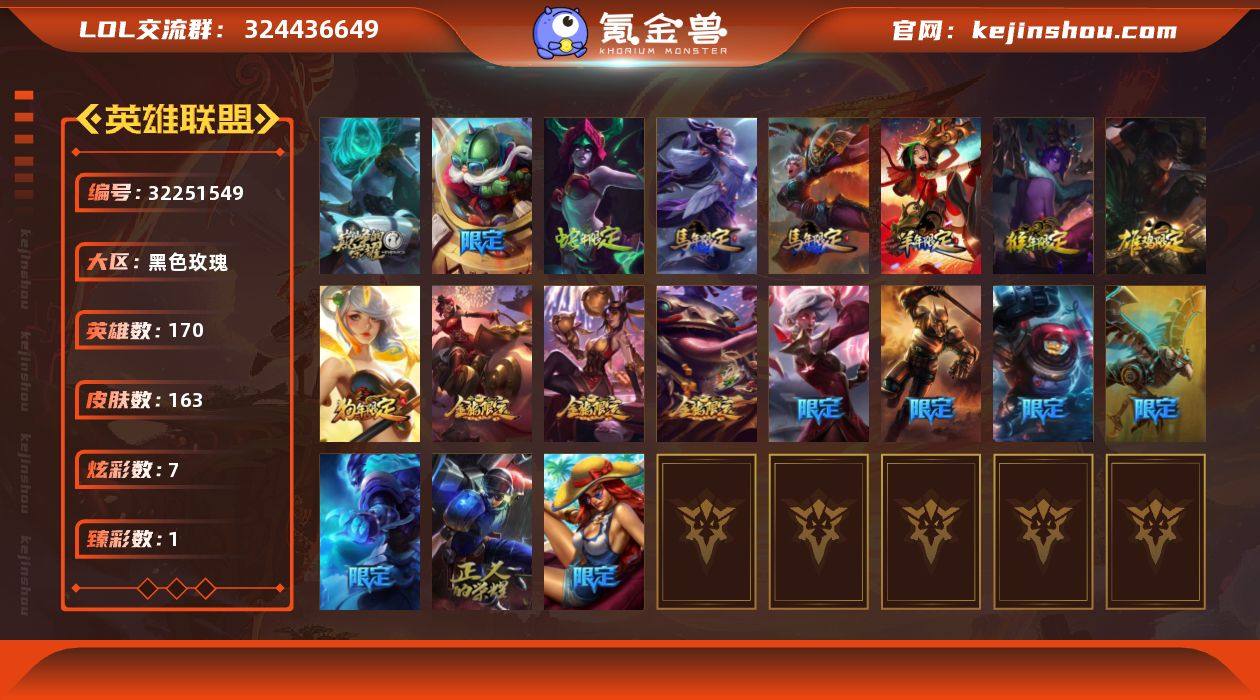 t37418【黑色玫瑰】163皮肤 7炫彩 1臻彩 2神话/36限定/19传说/170英雄 账号等级:341 【重要头像】烈焰美人薇恩 【重要皮肤】电玩勇者锐雯 电玩女神阿狸 替父从军花木兰 神龙烈焰金克丝 碧玉之牙卡西奥佩娅 春晖神女拉克丝 紫金罗刹莫甘娜 广寒仙子嫦娥 虎痴之拳蔚 金猪烈焰瑟庄妮 烈焰美人薇恩 纳财大帝塔姆 胜利之树茂凯 胜利女神奥莉安娜 胜利枪神格雷福斯 胜利之剑亚托克斯 灵魂收割者索拉卡 泳池派对厄运小姐 SSW锤石 SSW图奇 SSW辛吉德 暗杀星蒙多 Fnatic迦娜 Fnatic古拉加斯 防暴机器人布里茨 防暴天使凯尔 钢铁之翼艾尼维亚 冠军典狱长锤石 鬼影森森茂凯 警用试作体K9内瑟斯 圣诞精灵崔丝塔娜 圣诞狂欢基兰 外星装甲库奇 无头骑士赫卡里姆 幸福女神乐芙兰 征服者卡尔玛 十周年纪念安妮 源代码乐芙兰 绝息圣堂洛 【传说皮肤】陆地王者4WD布里茨 霸天异形卡兹克 黑夜使者亚索 铁哥们儿奥拉夫 神拳李青 银河魔装机神兰博 约德尔国队长提莫 烈焰雄心崔丝塔娜 炼狱魔犬内瑟斯 女校长菲奥娜 冰川巨兽墨菲特 战场女武神凯尔 血石领主弗拉基米尔 地狱行者孙悟空 暗星锤石 源计划林易 灌篮高手德莱厄斯 苍穹之光韦鲁斯 【重要炫彩】天煞劫黑洞