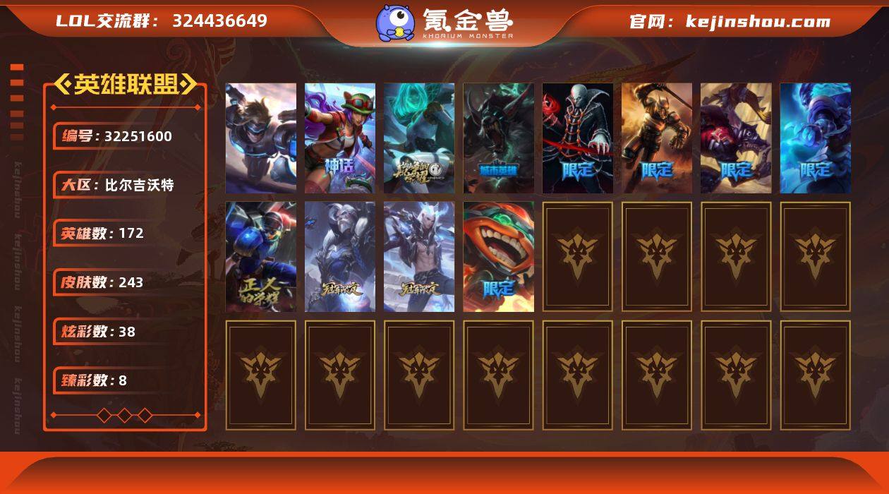 t37371【比尔吉沃特】 243皮肤 38炫彩 8臻彩 4神话/27限定/28传说/172英雄 账号等级:565 【重要头像】爱情之歌 可爱安妮 【重要皮肤】胜利剑圣易 胜利之王泰达米尔 胜利巨口克格莫 荣誉使者玛尔扎哈 神凰行者烈羽焰凰霞 点心宝贝阿木木 天龙之子斯莫德 胜利女神奥莉安娜 胜利枪神卢锡安 胜利之剑亚托克斯 EDG佛耶戈 EDG格雷福斯 SSW锤石 SKTT1婕拉 暗杀星蒙多 防暴天使凯尔 冠军典狱长锤石 春晖神女奇亚娜 海贼瑞兹 警用试作体K9内瑟斯 圣诞狂欢努努和威朗普 圣诞玩偶波比 暗影沃里克 诺斯费拉图弗拉基米尔 阿木木主人不要我了 都铎王朝图奇 十五周年纪念希维尔 十周年纪念安妮 源代码乐芙兰 神凰行者瑞羽圣凰艾尼维亚 胜利凤凰艾尼维亚 暗裔英雄盖伦 未来战士伊泽瑞尔 【传说皮肤】魔女伊芙琳 源计划超体莫德凯撒 黯晶凤凰艾尼维亚 天煞劫 星之守护者洛 苍穹之光韦鲁斯 电玩女神娑娜 冰霜亚龙希瓦娜 苹果机器人布里茨 灵魂莲华阿狸 大天使长米迦勒凯尔 屠龙勇士潘森 地狱行者孙悟空 红色男爵库奇 战地巨兽科加斯 绅士科加斯 欧米伽小队幽灵特工 提莫约德尔人的一大步 烈焰雄心崔丝塔娜 霸天异形卡兹克 战场女武神凯尔 最终BOSS维迦 律政大亨蒙多 暗星尊烬 泳池派对吉格斯 宇航员诺提勒斯 偶像歌手阿狸 黯黑魔龙希瓦娜 【重要炫彩】无畏骑士瑟庄妮赤子初心 张辽文远炫金将军 征服者韦鲁斯炫金 净雪之月莫甘娜冬虹 玉剑传说无劫胭脂 山海绘卷科加斯朱红 暗影沃里克至真至诚 海之歌艾希冰爽浪花