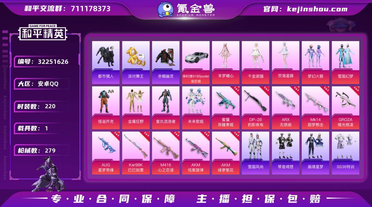 【AUG星梦奇缘小丑金鞋都市男神天网冰雪女王猫包10特效枪9粉装1载具素材号 秒换绑不用等】 安卓Q区-91740热力值-220套装-279枪皮 【1载具】 保时捷918 Spyder(液态银)【8稀有】 赤蝎幽灵 都市猎人 派对舞王(金靴子) 百万伏待背包(猫包) 派对舞王 冷酷挑战者 天网终结者【9粉装】 怪诞乔克(小丑) 梦幻火箭 雪国幻梦(冰雪女王) 复仇流浪者 金属狂野 未来歌姬 角色-荧海星豚 角色-羊梦糖心 角色-千金淑猫【10特效枪】 AUG-星梦奇缘(3级) M416-心之恋语(7级) AKM-炫紫旋律(6级) AKM-绿萝繁花(5级) ARX-无垠阁(4级) 蜜獾-异瞳寒姬(4级) Kar98K-巳巳如意(5级) Mk14-甜梦熊击(5级) GROZA-镜光银凌(5级) DP-28-豹影疾电(5级)【267热门】 深海小丑鱼 暗影哥特(红眼罩) 浪漫天命 团圆交子 瑞龙福将 冰川格斗者 白色伏地魔 SS27特训 SS26特训 SS25特训 SS24特训 SS23特训 SS22特训 Mini14-梦幻火箭 SCAR-L-玉兔迎春 GROZA-田园牧歌 M762-天降萌叽 Mk47-乌木金纹 UZI-娇憨猪猪 UMP45-蓝色火焰 DBS-彩虹符号 M249-彩虹符号 MG3-幻世战舞者 AKM-虎虎生威 AKM-霓虹街区 呆萌铁蟹 鹰眼刺客 M416-蓝色火焰 GROZA-异彩先驱 软萌银虎 破蛋小黄鸡 长空猛禽 弄潮海豚 异彩先驱 虚音幻奏 夏日倾情 甜心亚梦 甜蜜熊情侣 特训学院 燃烧卡路里 青涩时光 青年教官 牛气冲天 霓虹街区 霓虹极客 妙红点点 懵萌河马 魅力单车 六六大吉 猎鹰 黎明保卫者 蓝色运动 橘黑制服 坚韧舞者 活力之心 黄色运动 漫步者 黄色伏地魔 红色运动 黑色伏地魔 海岛探路者 纯真浪花 春日漫步 M762-瑞龙福将 S1897-糯团青竹 平底锅-画境星梦 P90-紫矿核心 GROZA-紫矿核心 AC-VAL-玩趣呆呆 顶瓜瓜 冰河战士 雏菊兔兔 恋语绒绒 SS34特训 漫游都市 朱霞炽焰 蜜獾-鸡智如我