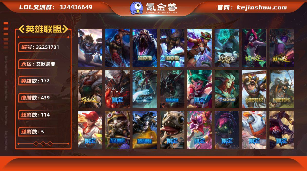 t37415【艾欧尼亚】 439皮肤 114炫彩 5臻彩 6神话/75限定/31传说/172英雄 账号等级:585 单双排段位:铂金 【重要头像】披萨鸡 送披萨的小姐姐希维尔 【重要皮肤】海克斯科技雷克顿 海克斯科技阿利斯塔 胜利行刑官德莱文 胜利剑圣易 胜利女神娑娜 胜利之王泰达米尔 胜利巨口克格莫 哥特萝莉安妮 勇敢的心德莱厄斯 电玩女神厄运小姐 电玩勇者锐雯 银龙裁决泰隆 碧玉之牙卡西奥佩娅 紫金罗刹莫甘娜 司马懿仲达 胜利女神奥莉安娜 胜利枪神卢锡安 胜利之剑亚托克斯 雪球也能爆炸吉格斯 冬季仙境卡尔玛 魅惑女巫莫甘娜 泳池派对厄运小姐 泳池派对塔里克 泳池派对李青 送披萨的小姐姐希维尔 鸡里奥 克格汪 SKTT1辛德拉 SSW锤石 SSW雷恩加尔 SSW泰隆 SSW图奇 SSW辛吉德 暗杀星奥莉安娜 暗杀星蒙多 暗杀星努努和威朗普 暗杀星伊泽瑞尔 Fnatic迦娜 Fnatic古拉加斯 Fnatic嘉文四世 冰雪节格雷福斯 冰雪节玛尔扎哈 冰雪节辛吉德 防暴士兵格雷福斯 防暴士兵辛吉德 防暴天使凯尔 钢铁之翼艾尼维亚 冠军典狱长锤石 鬼影森森茂凯 鬼影重重魔腾 胡桃夹子萨科 惊悚派对阿木木 惊悚派对费德提克 蓝色忧郁崔斯特 密林猎手提莫 南瓜头费德提克 圣诞精灵崔丝塔娜 圣诞狂欢基兰 圣诞老人古拉加斯 圣诞玩偶波比 圣诞驯鹿克格莫 喜庆之树茂凯 邪恶圣诞老人维迦 幸福女神乐芙兰 雪装奈德丽 野兽猎人瑟庄妮 野兽猎人泰达米尔 永恒之森乐芙兰 征服者韦鲁斯 暗影沃里克 阿木木主人不要我了 波比的巧克力工坊 地底世界崔斯特 都铎王朝图奇 十五周年纪念希维尔 十周年纪念安妮 源代码乐芙兰 神凰行者瑞羽圣凰艾尼维亚 胜利凤凰艾尼维亚 灵魂守卫乌迪尔 未来战士伊泽瑞尔 绝息圣堂洛 【传说皮肤】钢铁之翼凯尔 腥红之月鬼武姬阿卡丽 丧尸布兰德 恶魔男...