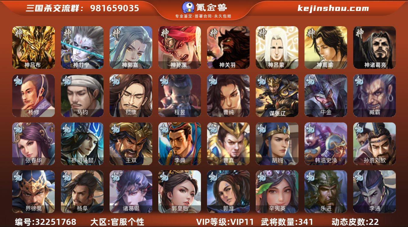 官阶:大将军;VIP等级:VIP11;史诗武将数量:27;动态皮肤数量:22;武将总数:341;史诗宝珠数量:2;将魂数量:1743;神将:5;魏国史诗武将:10;蜀国史诗武将:5;吴国史诗武将:4;群史诗武将:9