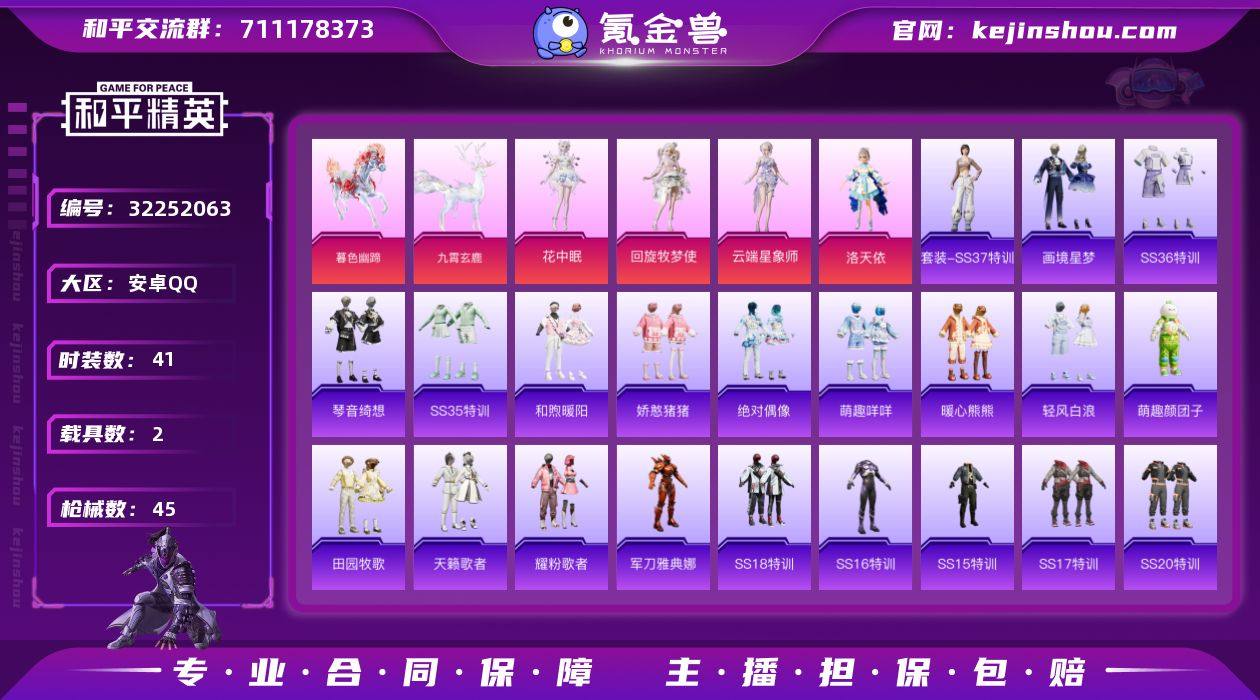 【和平精英】4粉装,4特效枪,4载具,历史最高段位:超级王牌12星 王牌印记10次 热力值:41150,77套装,108枪械,119装备,72战备;套装:暮色玫影-艾丽娅,灵驹仙姬-云歌,套装-梦幻火箭,角色-洛天依,角色-回旋牧梦使,角色-花中眠,套装-特训学院,套装-白色伏地魔,套装-骑行爱好者,套装-冰川格斗者,套装-竞技名士,套装-猛禽,套装-长空猛禽,套装-海岛探路者,套装-灼焰舞者,套装-战地菁英,套装-特殊使命,套装-燃烧卡路里,套装-完美偶像,套装-人气偶像,套装-酷萌兔限定,套装-魅力单车,套装-幻世战舞者,套装-麻辣教官,套装-北国孤狼,套装-牛气满满,套装-萌趣颜团子,套装-战术大师,套装-狙击之神,套装-SS18特训,套装-耀粉歌者,套装-飞行日记,套装-天籁歌者,套装-电音精灵,套装-SS15特训,套装-SS16特训,套装-SS17特训,套装-福星高照,套装-虎虎生威吉莉,角色-军刀雅典娜,套装-SS20特训,套装-SS21特训,套装-暖心熊熊,套装-萌趣咩咩,套装-娇憨猪猪,套装-玉兔迎春,套装-SS22特训,套装-和煦暖阳,套装-田园牧歌,套装-轻风白浪,套装-光之冒险,套装-SS23特训,套装-柠萌假日,套装-SS24特训,套装-龟仙人,套装-涂山之恋,套装-SS25特训,套装-惊鸿侠骨,套装-锦衣飞扬,套装-绝对偶像,套装-SS26特训,套装-空岛之星,套装-SS27特训,套装-老实芭蕉,套装-海盐绵绵冰,套装-SS31特训,套装-SS33特训,套装-SS32特训,套装-青翼流星,套装-SS34特训,套装-SS35特训,套装-琴音绮想,套装-画境星梦,套装-SS37特训,套装-SS36特训,角色-云端星象师,套装-福马献瑞;枪皮:GROZA-田园牧歌,GROZA-暮色玫影,GROZA-福马献瑞,3级SCAR-L-灵驹仙姬,SCAR-L-红色方程式,SCAR-L-玉兔迎春,SCAR-L-海盐豹豹,M416-蓝色火焰,M416-红色方程式,M416-糯团青竹,Mk47-洛神天依,Mk47-乌...