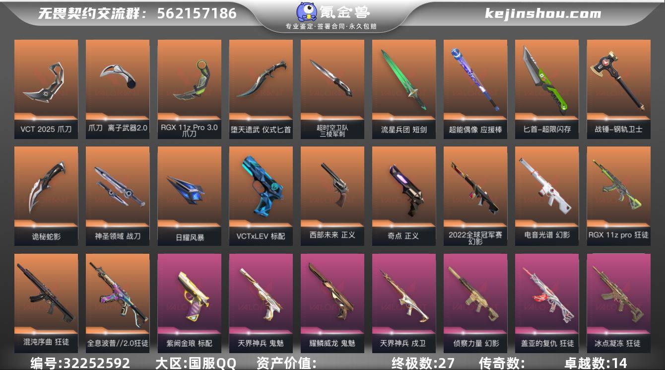 【WWQH373】终极*27/卓越*14/皮肤*131/等级*236/段位:神话/VCT 2025赛季礼包/耀鳞威龙套装/幻棱/炼狱/维斯/暮蝶/钛狐/壹决/铁臂/捷风/雷兹/幽影/不死鸟/贤者/猎枭/蝰蛇/零/芮娜/奇乐/尚勃勒/霓虹/斯凯/夜露/星礈/K/O/海神/盖可/黑梦/钢锁/超时空卫队 三棱军刺/VCT 2025 爪刀/紫金爪刀/爪刀-RGX 11z Pro 3.0/落英飞旋/威龙之刃/离子武器2.0 爪刀/未来开拓者/短剑-流星兵团/超能偶像 应援棒/匕首-超限闪存/定海神珍/堕天遗武 仪式匕首/战锤-钢轨卫士/天玄刀/天御刀/诡秘蛇影/神圣领域 战刀/日耀风暴/狂徒-混沌序曲/狂徒-全息波普//2.0/狂徒-RGX 11z pro/狂徒-冰点凝冻/狂徒-掠影/狂徒-盖世英雄/狂徒-盖亚的复仇/狂徒-耀鳞威龙/狂徒-紫阙金琅/狂徒-离子武器2.0/狂徒-超能偶像/狂徒-钢轨卫士/狂徒-流星兵团/狂徒-诡秘蛇影/幻影-2022全球冠军赛/幻影-电音光谱/幻影-侦察力量/幻影-超限闪存/幻影-神圣领域/幻影-聚合之力/幻影-战术小伙伴/幻影-末日之翼/戍卫-天界神兵/戍卫-超能偶像/戍卫-钢轨卫士/戍卫-浮光跃金/戍卫-战术熊与伙伴们/戍卫-月球哨兵/戍卫-折光棱晶/獠犬-神圣领域/獠犬-采蜜小蜂队/獠犬-模拟赫兹/獠犬-战术小伙伴/冥驹-堕天遗武/冥驹-盖世英雄/冥驹-模拟赫兹/冥驹-星云暗涌/飞将-聚合之力/飞将-光导纤维/飞将-战术熊与伙伴们/飞将-末日之翼/莽侠-超限闪存/莽侠-诡秘蛇影/莽侠-纤云弄巧/莽侠-月球哨兵/战神-神圣领域/战神-采蜜小蜂队/战神-浮光跃金/奥丁-流星兵团/奥丁-战术小伙伴/奥丁-末日之翼/判官-超能偶像/判官-诡秘蛇影/判官-采蜜小蜂队/雄鹿-模拟赫兹/雄鹿-月球哨兵/骇灵-流星兵团/骇灵-浮光跃金/骇灵-光导纤维/骇灵-星云暗涌/蜂刺-超限闪存/蜂刺-聚合之力/蜂刺-纤云弄巧/蜂刺-战术小伙伴/蜂刺-星云暗涌/蜂刺-折光棱晶/标配-紫阙金琅/标配-超能偶像/标配-浮光跃金/标配-光导纤维/标配-战术熊与伙伴...