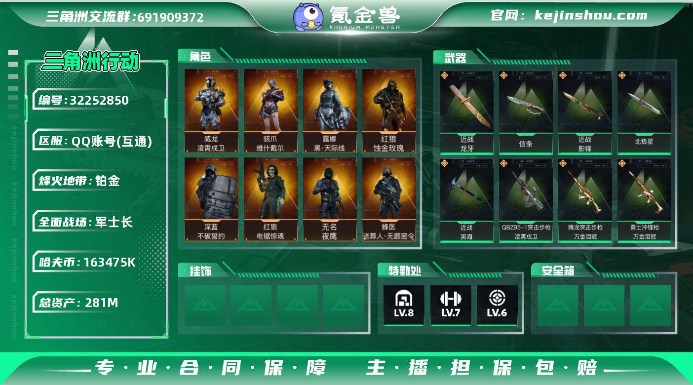 【SJ8623】总资产(M):281M/哈夫币(K):163475K/哈夫币(K):163475K/传说枪皮数:29/全面战场等级:50_段位:军士长/烽火地带等级:60_段位:铂金/红狼-蚀金玫瑰/露娜-黑·天际线/骇爪-维什戴尔/威龙-凌霄戍卫/蜂医-送葬人·无题密令(S5)/无名-夜鹰(S4)/深蓝-不破誓约(S6)/红狼-电锯惊魂/近战-北极星/近战-信条/近战-黑海/近战-影锋/近战-龙牙/近战-黑鹰/M4A1突击步枪-蚀金玫瑰/M4A1突击步枪-阿米娅/QBZ95-1突击步枪-凌霄戍卫/M16A4突击步枪-狩猎时刻/SG552突击步枪-运动员/AK-12突击步枪-夜鹰/SCAR-H战斗步枪-启航/G3战斗步枪-狩猎时刻/CAR-15突击步枪-阿米娅/腾龙突击步枪-捞点薯条/腾龙突击步枪-万金泪冠/K437突击步枪-北极星/KC17突击步枪-电锯惊魂/MP5冲锋枪-黑海/P90冲锋枪-信条/Vector冲锋枪-狩猎时刻/勇士冲锋枪-能天使-午夜邮差/勇士冲锋枪-万金泪冠/QCQ171冲锋枪-北极星/725双管霰弹枪-送葬人-无题密令/M250通用机枪-骑士之心/QJB201轻机枪-黑海/M14射手步枪-蛮荒/SR-25射手步枪-信条/R93狙击步枪-维什戴尔/AWM狙击步枪-捞点薯条/AWM狙击步枪-万金泪冠/93R-捞点薯条/复合弓-黑-天际线/PTR-32突击步枪-碎冰行动(典藏)/AKM突击步枪-林中猎手/QBZ95-1突击步枪-竞技风/Ash-12战斗步枪-守夜人/ASh-12战斗步枪-无极限/M16A4突击步枪-竞赛选手/AUG突击步枪-蝮蛇/SG552突击步枪-尖端治疗/SG552突击步枪-深海恐惧/SCAR-H战斗步枪-囚徒/G3战斗步枪-流沙送葬/AS Val突击步枪-尖端治疗/AS Val突击步枪-百步穿杨/腾龙突击步枪-无垢/腾龙突击步枪-猎鳄行动/K437突击步枪-守护者/MP5冲锋枪-战术竞备/MP5冲锋枪-竞技风/P90冲锋枪-暗影猎手/P90冲锋枪-紧急戒备/Vector冲锋枪-阿萨拉文明/Vector冲锋枪-猎鳄行动/Vector冲锋枪-百步穿杨/SR-3M紧凑突击步枪-荒野求生/SR-3M紧凑突击步枪-战术竞备/勇士冲锋枪-工业狂潮/MP7冲锋枪...