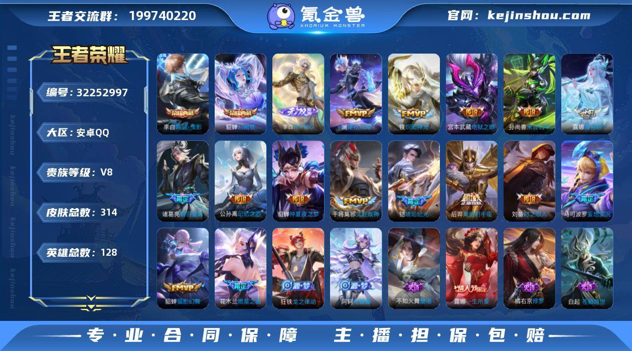族8/皮肤314/典藏3/传说17/史诗79/英雄128/孙权全皮/敖隐全皮/戈娅全皮/影全皮/李白-鸣剑·曳影/花木兰-九霄神辉/貂蝉-幻阙歌/李白-碎月剑心/桑启-鸣野蒿/铠-琥珀纪元/澜-逐花归海/露娜-霜月吟/马可波罗-妄想实况/诸葛亮-鹤羽星尊/公孙离-记忆之芯/花木兰-燃星之曲/镜-炽阳神光/虞姬-启明星使/刘备-时之恋人/貂蝉-猫影幻舞/干将莫邪-久胜战神/后羿-黄金射手座/貂蝉-仲夏夜之梦/孙尚香-末日机甲/宫本武藏-地狱之眼/姜子牙-天穹之誓/杨戬-破阵·退雄兵/狄仁杰-阴阳师/赵云-皇家上将/嬴政-优雅恋人/孙尚香-蔷薇恋人/庄周-高山流水/高渐离-死亡摇滚/阿轲-迷踪丽影/元歌-云间偶戏/元歌-无心/狄仁杰-魔术师/狄仁杰-万华元夜/达摩-沙漠行僧/项羽-海滩派对/老夫子-醍醐杖/程咬金-演武夺筹/露娜-一生所爱/刘邦-夺宝奇兵/韩信-飞衡/王昭君-午后时光/兰陵王-金庭之子/亚瑟-潮玩骑士王/后羿-圣弓游侠/李元芳-云中旅人/钟馗-驱傩正仪/女娲-朔望之晖/干将莫邪-真爱魔法/雅典娜-单词大作战/雅典娜-黎明之约/蔡文姬-繁星吟游/太乙真人-华丽摇滚/鬼谷子-原初探秘者/鬼谷子-五谷丰年/苏烈-千军破阵/百里玄策-原初追逐者/沈梦溪-大漠名商/明世隐-疑决卦/裴擒虎-擒涛扼浪/狂铁-电玩高手/云中君-纤云...