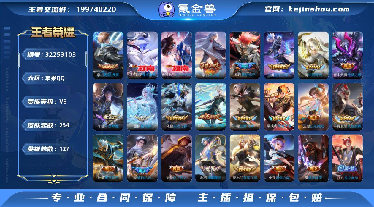 族8/皮肤254/典藏2/传说27/史诗71/英雄127/蒙恬全皮/影全皮/李白-鸣剑·曳影/花木兰-九霄神辉/伽罗沧流箭/鲁班七号-江户川柯南/马可波罗-怪盗基德/云缨神骥越千峰/关羽神骥镇沧海/花木兰异界灵契/澜-愿照·九州拓/云缨-幻光神枪/裴擒虎-祥瑞亨通/桑启-鸣野蒿/赵云-乘龙·铭钟鼎/马超-琥珀纪元/铠-琥珀纪元/澜-逐花归海/露娜-霜月吟/吕布-怒海麟威/马超-无双飞将/孙策-末日机甲/赵云-淬星耀世/小乔-音你心动/铠-绛天战甲/镜-炽阳神光/虞姬-启明星使/曜-云鹰飞将/李信-一念神魔/刘备-时之恋人/干将莫邪-久胜战神/花木兰-冠军飞将/李白-凤求凰/宫本武藏-地狱之眼/蒙犽-顽岩魄/蔡文姬-夏日便利店/虞姬-夏日便利店/姜子牙-天穹之誓/狄仁杰-阴阳师/赵云-皇家上将/元歌-无心/狄仁杰-魔术师/达摩-沙漠行僧/项羽-海滩派对/韩信-飞衡/孙悟空-孙行者/李元芳-云中旅人/干将莫邪-胡桃夹子/雅典娜-黎明之约/鬼谷子-五谷丰年/百里玄策-原初追逐者/沈梦溪-大漠名商/裴擒虎-李小龙/裴擒虎-擒涛扼浪/云中君-纤云弄巧/鲁班大师-探海日志/桑启-海盐诗旅/暃-星界游侠/阿古朵-江河有灵/张良-古海寻踪/蒙犽-百解令/蒙恬-荣光圣徽/高渐离-燃音魔法/妲己-灵卜魔法/鬼谷子-天穹祈灯/伽罗-琥珀纪元/姬小满-妄...