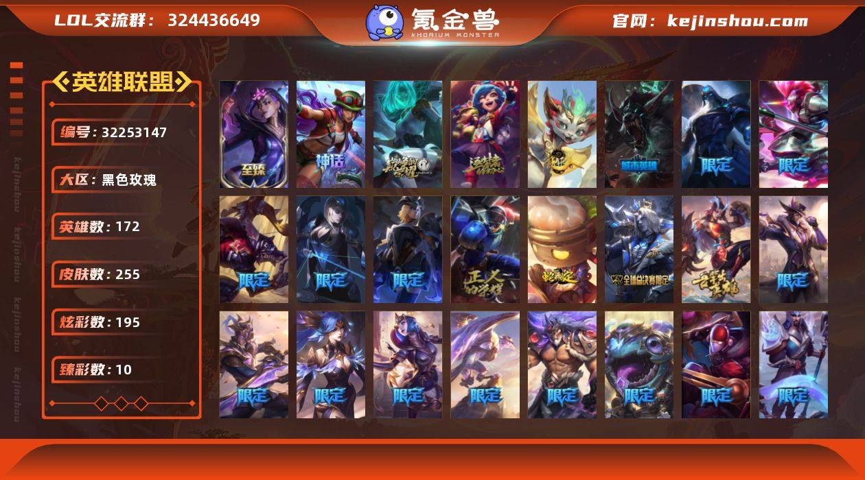 黄金段位-172英雄-255皮肤-195炫彩-0终极-4神话-37限定-22传说-54史诗 【神话皮肤】:十周年纪念安妮,源代码乐芙兰,十五周年纪念希维尔 【至臻皮肤】:至臻暗星女王黛安娜 【臻彩皮肤】:无畏骑士瑟庄妮赤子初心,闭月之颜貂蝉炫金莲华,玉剑传说翼剑仙珠光,霸天异形卡兹克刹那银光,灵魂莲华亚索霜见之时,可爱可爱粉红红布里茨,幻灵战斗队长厄运小姐勇气赞歌,魔女阿卡丽虚荣,净雪之月莫甘娜冬虹 【年限皮肤】:天龙之子斯莫德,点心宝贝阿木木,龙马烈焰波比 【冰雪限定】:冰雪风暴希维尔,圣诞狂欢努努和威朗普,阿木木“主人不要我了”,邪恶圣诞老人维迦,魄罗骑士瑟庄妮,寒冬精灵璐璐,冰雪节格雷福斯,北极星神黛安娜 【限定皮肤】:冠军之血希瓦娜,冠军之箭艾希,冠军之志瑞兹,2024全球总决赛佛耶戈,SKTT1劫,SSG嘉文四世,EDG厄斐琉斯,暗裔英雄盖伦,胜利女神奥莉安娜,胜利凤凰艾尼维亚,胜利之王泰达米尔,胜利巨口克格莫,胜利女神娑娜,胜利剑圣易,胜利之运崔斯特,胜利女神菲奥娜,死亡誓约卡特琳娜,鬼影重重魔腾,鬼影森森茂凯,魅惑女巫厄运小姐,暗影沃里克,电玩战魂赫卡里姆,都铎王朝图奇,玉剑传说舞龙卫,防暴天使凯尔 【传说皮肤】:魔幻卡牌崔斯特,战场女武神凯尔,源计划林易,约德尔国队长提莫,驯龙炮手崔丝塔娜,源计划联合艾希,鬼魂新娘莫甘娜,律政大亨蒙多,电玩女神娑娜,冰霜之刃艾瑞莉娅,太空律动猫猫布里和里茨,地狱行者孙悟空,神拳李青,神龙尊者圣龙李青,银河魔装机神兰博,第三类接触黑默丁格,死亡骑士盖伦,焰尾妖狐阿狸,霸天异形卡兹克,黑夜使者亚索,神龙尊者昼日真龙亚索,天煞劫 【史诗皮肤】:皇家火枪手崔斯特,腥红之月崔斯特,特战先锋赵信,翼骑统领赵信,屠龙勇士赵信,铁钩船长费德提克,圣光审判凯尔,天人合一易,地狱火阿利斯塔,圣洁...