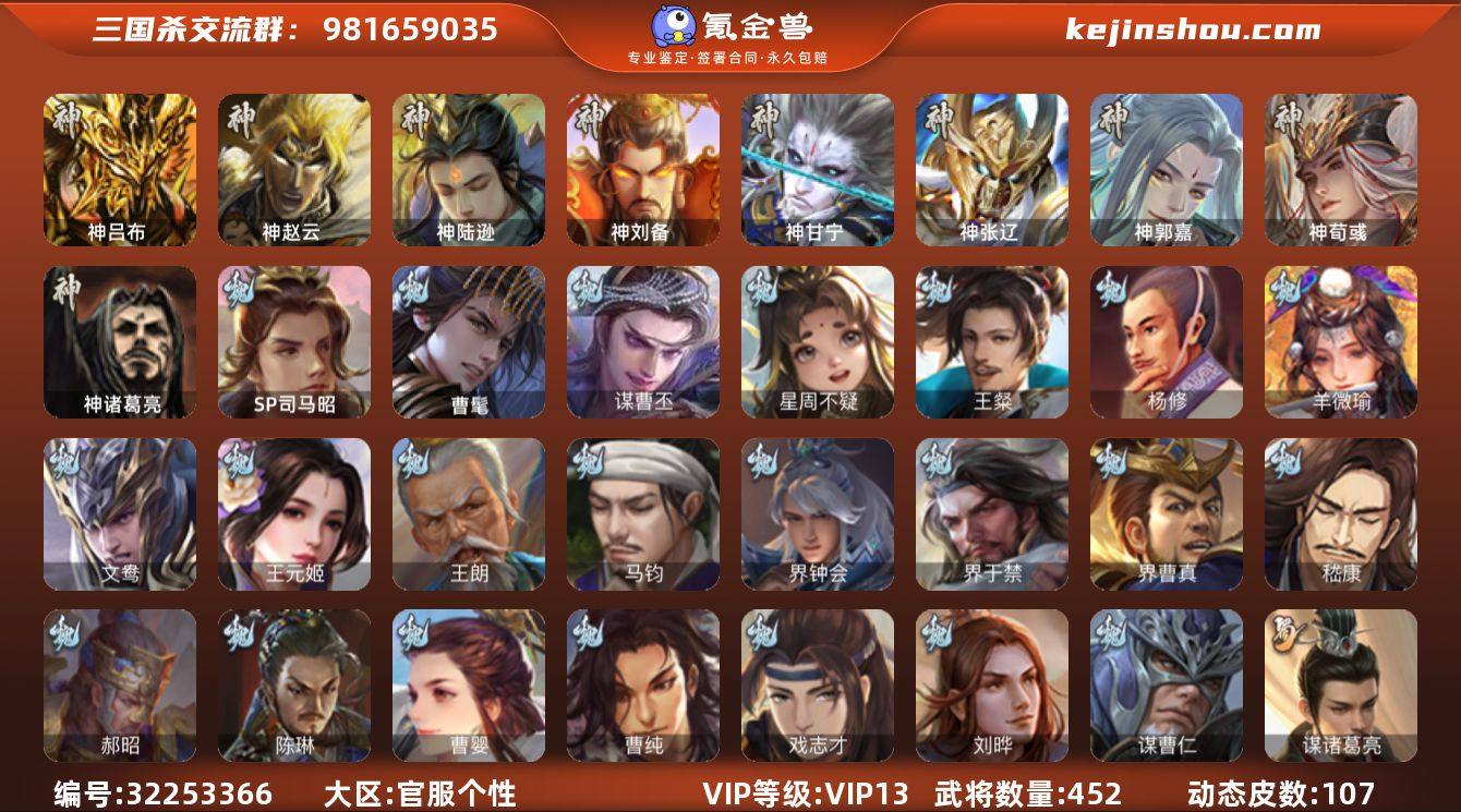 VIP等级: VIP13 官阶: 大将军 武将数量: 487 动态皮肤数量: 80 神将: 神甘宁,神郭嘉,神刘备,神陆逊,神吕布,神司马懿,神孙策,神太史慈,神荀彧,神张辽,神赵云,神关羽,神吕蒙,神周瑜,神诸葛亮,神鲁肃 魏国武将: 刘晔,戏志才,曹纯,曹婴,陈琳,程昱,郝昭,嵇康,界曹真,界于禁,界钟会,魏-司马昭,王朗,王凌,王元姬,文鸯,杨修,王粲,唐咨-魏,张辽,SP蔡文姬,SP曹仁,SP关羽,SP贾诩,SP姜维,SP庞德,卞夫人,蔡贞姬,曹昂,曹操,曹冲,曹洪,曹丕,曹仁,曹叡,曹嵩,王异,张恭,鲁芝,界满宠,曹休,界曹植,满宠,荀攸,王基,钟繇,蒯越蒯良,郭嘉,牵招,荀彧,阮慧,杜畿,界郭嘉,崔琰,界曹丕,界荀彧,朱灵,界甄姬,吕虔,界陈群,界王异,界许褚,界郭淮,华歆,陈群,界邓艾,界典韦,界曹休,袁涣,李通,乐进,辛宪英,谋曹仁,郭淮,毛玠,界曹彰,郭皇后,毌丘俭,夏侯惇,曹植,司马朗,谋于禁,界曹操,星周不疑,许褚,界张辽,谋徐晃,张郃,钟会,文聘,郭女王,曹彰,界夏侯惇,诸葛诞,司马懿,甄姬,界徐晃,徐晃,界曹仁,孙资刘放,韩浩史涣,胡班,曹真,典韦,界夏侯渊,夏侯渊,李典,于禁,王双,邓艾,界司马懿,张春华,孟达-魏,臧霸,牛金,朱灵(国战),曹髦,玄·毌丘俭,李昭焦伯,清河公主,SP司马昭,司马伷,董昭,谋张辽,谋夏侯渊,势国渊 蜀国武将: 董允,关索,花鬘,界黄忠,傅佥,谯周,沙摩柯,王平,张星彩,赵襄,周群,诸葛瞻,谋马超,谋赵云,马云騄,谋黄月英,徐庶,界魏延,杨仪,吕凯,界关羽,界诸葛亮,邓芝,界伊籍,胡金定,费祎,严颜,界黄月英,界张嶷,赵云,张松,彭羕,李丰,界刘备,界刘禅,谋姜维,刘封,糜竺,李遗,蒋琬,谋庞统,黄月英,刘巴,关羽,王甫赵累,吴懿,吴班,界吴懿,界廖化,向宠,祝融,张飞,黄皓,魏延,界周仓,马忠,界法正,糜夫人,界孟获,刘禅,界赵云,谋诸葛亮,界姜维,张翼,关银屏,界祝融,SP孙尚香,SP徐庶,卧龙诸葛,宗预,周仓,简雍,界关兴张苞,诸葛亮,孙乾,界张飞,界卧龙诸葛,法正,赵统赵广,陈到,...