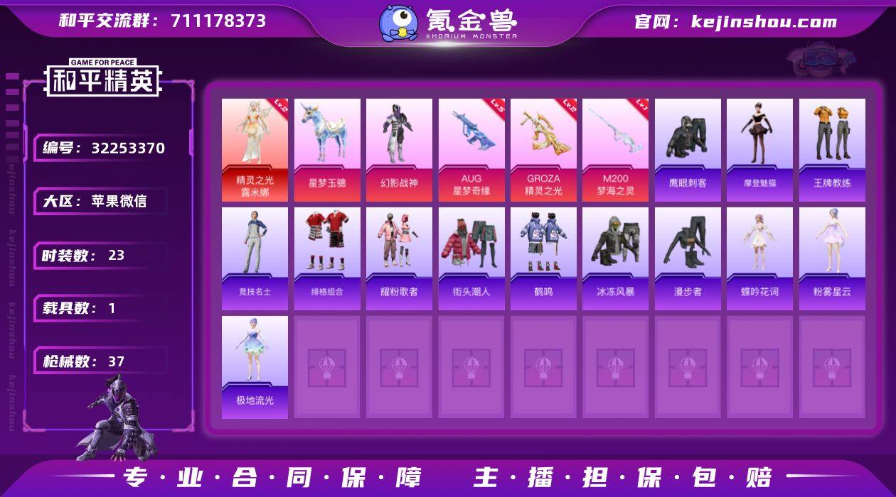 【特价出售/店主推荐】 苹果 微信-1神装-1粉装-4特效枪-1载具-5粉色飞行器-15927热力值-1王牌印记-23套装-37枪皮【红色神装等级】:精灵之光-露米娜(二级)【红色角色神装】:精灵之光-露米娜【粉色套装】:粉装-幻影战神【粉色枪皮等级】:GROZA-精灵之光(二级),AUG-星梦奇缘(五级),Mk14-福马献瑞(五级),M200-梦海之灵(一级【粉色载具】:星梦玉骢【粉色枪皮】:GROZA-精灵之光,AUG-星梦奇缘,Mk14-福马献瑞,M200-梦海之灵