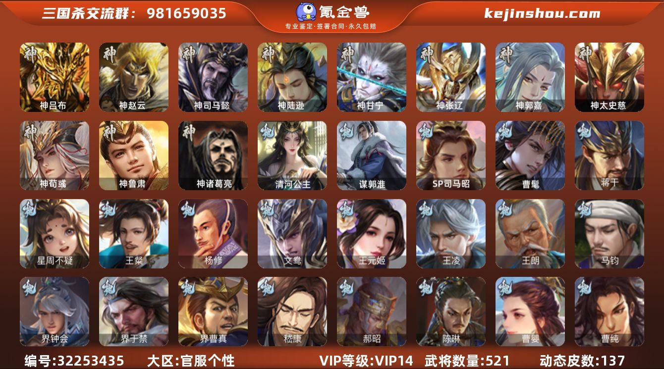 【599】官阶:大将军;VIP等级:VIP14;史诗武将数量:93;动态皮肤数量:137;武将总数:521;史诗宝珠数量:19;将魂数量:12265;神将:14;魏国史诗武将:57;蜀国史诗武将:15;吴国史诗武将:14;群史诗武将:36 神吕布,神赵云,神司马懿,神陆逊,神甘宁,神张辽,神郭嘉,神太史慈,神荀彧,神关羽,神吕蒙,神周瑜,神诸葛亮,神鲁肃,SP司马昭,曹髦,星周不疑,王粲,杨修,文鸯,王元姬,王凌,王朗,魏-司马昭,马钧,界钟会,界于禁,界曹真,嵇康,郝昭,陈琳,曹婴,曹纯,戏志才,刘晔,蒋干,谋郭淮,清河公主,关索,谋诸葛亮,马云騄,谋赵云,谋马超,诸葛瞻,赵襄,张星彩,王平,沙摩柯,谯周,界黄忠,花鬘,董允,谋关羽,张奋,谋陆逊,谋黄盖,谋孙策,周处,吴景,孙皓,骆统,留赞,界朱然,界徐盛,界步练师,贺齐,势太史慈,谋郭嘉,谋黄月英,谋荀彧,谋公孙瓒,十常侍,裴秀,左慈,张让,张琪瑛,杨彪,星黄忠,星甘宁,王允,陶谦,苏飞,司马徽,麹义,庞德公,南华老仙,祢衡,刘焉,沮授,界左慈,界李儒,公孙康,杜预,卑弥呼,鲍信,谋张角,张绣,李傕,阎象,许攸,陈珪,友徐庶,星董卓,神鲁肃-九州为局,神张辽-威震江东,神郭嘉-虎年清明(动态),神太史慈-勇撼日月(动态),神孙策-霸王再世(动态),神荀彧-虎年清明(动态),神荀彧-匡汉延祚(动态),神张辽-散敌擒孙,神周瑜-波澜不惊,神吕蒙-心生万象,神郭嘉-半醉山河,神甘宁-万人辟易(动态),神陆逊-绽焰摧枯(动态),神关羽-佑子伐吴,神吕蒙-兼资文武(动态),神周瑜-陵光引灵(动态),神曹操-天下归心,神吕布-冠绝天下(动态),神赵云-战龙在野(动态),神赵云-神龙天降,神司马懿-鉴往知来(动态),王元姬-婆娑起舞(动态),郭嘉-以身证道(动态),星周不疑-才广志宏(动态),钟会-龙年端午(动态),钟会-潜蛟觊天(动态),曹丕-气荡山河(动态),星周不疑-龙年清明(动态),甄姬-明珠耀躯(动态),曹丕-龙年中秋(动态),曹叡-睥睨天下(动态),SP蔡文姬-兔年冬日(...