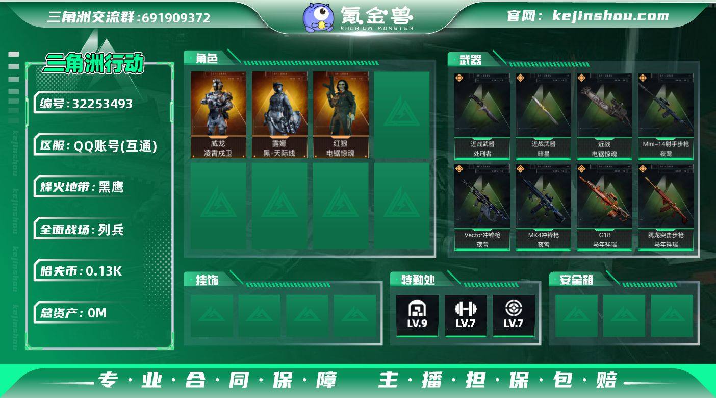 实名: 不可修改 烽火地带段位: 黑鹰 全面战场段位: 列兵 总资产: 561 哈夫币: 135 干员外观: 露娜-黑·天际线,红狼-电锯惊魂,威龙-凌霄戍卫 传说武器皮肤: CAR-15突击步枪-阿米娅,复合弓-黑-天际线,Vector冲锋枪-狩猎时刻,G3战斗步枪-狩猎时刻,M16A4突击步枪-狩猎时刻,AWM狙击步枪-捞点薯条,腾龙突击步枪-捞点薯条,93R-捞点薯条,勇士冲锋枪-能天使-午夜邮差,近战-电锯惊魂,SCAR-H战斗步枪-启航,ASh-12战斗步枪-鹅鸭杀,QCQ171冲锋枪-鹅鸭杀,QJB201轻机枪-鹅鸭杀,G3战斗步枪-骑士,KC17突击步枪-电锯惊魂,SG552突击步枪-运动员,SKS射手步枪-骑士,近战-暗星,MK47突击步枪-暗星,SR-3M紧凑突击步枪-暗星,近战-处刑者,QBZ95-1突击步枪-凌霄戍卫,腾龙突击步枪-马年祥瑞,G18-马年祥瑞,Vector冲锋枪-夜莺,MK4冲锋枪-夜莺,Mini-14射手步枪-夜莺,勇士冲锋枪-万金泪冠,腾龙突击步枪-万金泪冠,AWM狙击步枪-万金泪冠,.357左轮-缄花,SR-25射手步枪-缄花,M14射手步枪-缄花