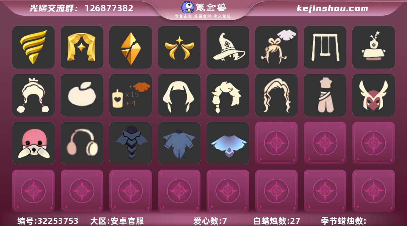 账号类型: 邮箱账号 季节已毕业: 潜海季,表演季,破晓季,欧若拉季 珍稀物品: 白枭,透明蝶翼斗 礼包: 巫师,绊爱,秋千,茶桌,绒帽,橘子,创始人 裤子: 蓝绿裤 面具: 呼吸面具,黄眉企鹅面具 面饰: 红耳机 发型: 虚荣,单侧绑发,留辫蘑菇头 斗篷: 遥鲲斗篷,燕尾斗篷,冥龙斗篷 亮点: 【优质装备】:表演季,白枭(帝企鹅发),潜海季,破晓季,透明蝶翼斗,欧若拉季(欧若拉),蓝绿裤(高领舞服),呼吸面具(潜水面具),黄眉企鹅面具,单侧绑发(单边小辫),留辫蘑菇头,遥鲲斗篷(双翼遥鲲斗),燕尾斗篷,冥龙斗篷,绊爱(绊爱斗篷)(绊爱礼包),秋千(情人秋千),茶桌(花憩茶桌),红耳机,巫师(巫师帽),绒帽(温暖绒帽),创始人(创始人斗篷),橘子(大橘大利)
