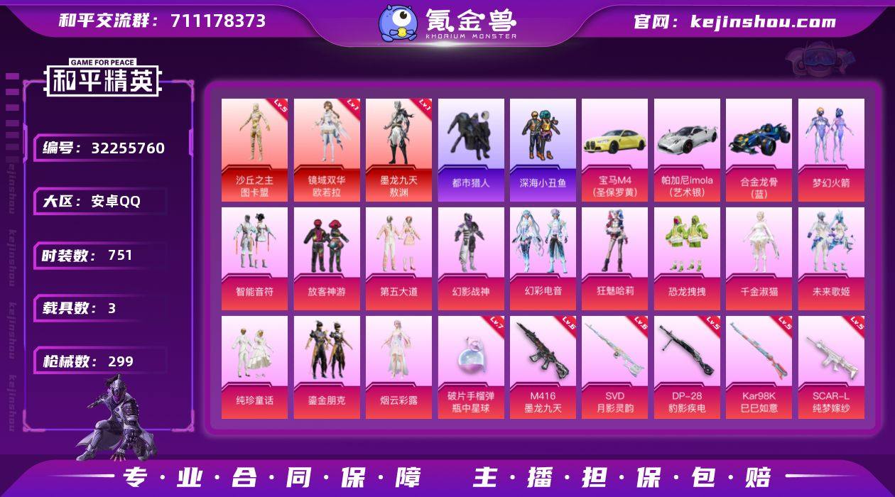 【特价出售】 钱包不能注销安卓Q-3红装2稀有3载具13粉装17特效枪12热门203套装299枪皮 116982热力值 18印记 历史无敌战神 【3红装】 墨龙九天-敖渊 (1级) 镜域双华-欧若拉 (1级) 沙丘之主-图卡盟 (5级) 【2稀有】 都市猎人 浪漫天命 【3载具】 帕加尼imola(艺术银) 宝马M4(圣保罗黄) 合金龙骨蓝色 【13粉装】 狂魅哈莉 梦幻火箭 千金淑猫 鎏金朋克 烟云彩露 未来歌姬 幻影战神 幻彩电音 智能音符 放客神游 纯珍童话 第五大道 恐龙拽拽 【17特效枪】 M416-五爪金龙 (4级) SCAR-L-纯梦嫁纱 (5级) M416-墨龙九天 (6级) AKM-幽焰骑士 (3级) AKS-74U-星穹咏叹调 (4级) UMP45-宇宙意志 (3级) Kar98K-巳巳如意 (5级) MG3-辉羽雀灵 (3级) DP-28-豹影疾电 (5级) AUG-圣斗士星矢 (2级) AUG-许七安 (6级) Mk14-精灵梦叶罗丽 (4级) M24-镜域双华 (3级) GROZA-圣辉之星 (4级) M417-第五大道 (2级) AKM-梦之光华 (5级) 破片手榴弹-瓶中星球 (7级) 【12热门】 Mark.06 小丑鱼 龟仙人 雪山精英 呆萌铁蟹 鹰眼刺客 深海小丑鱼 暗影哥特 忍者信条 狂沙舞者 漫步者 新侠客行 【6飞行器】 龙翔九天飞行器 星之信仰飞行翼 深渊漩涡飞行器 镜光幻境飞行翼 炎氏战神飞行翼 黄族统领飞行器 【2头盔】 梦幻火箭头盔 幻影战神头盔 【2背包】 幻影战神背包 深海小丑鱼背包