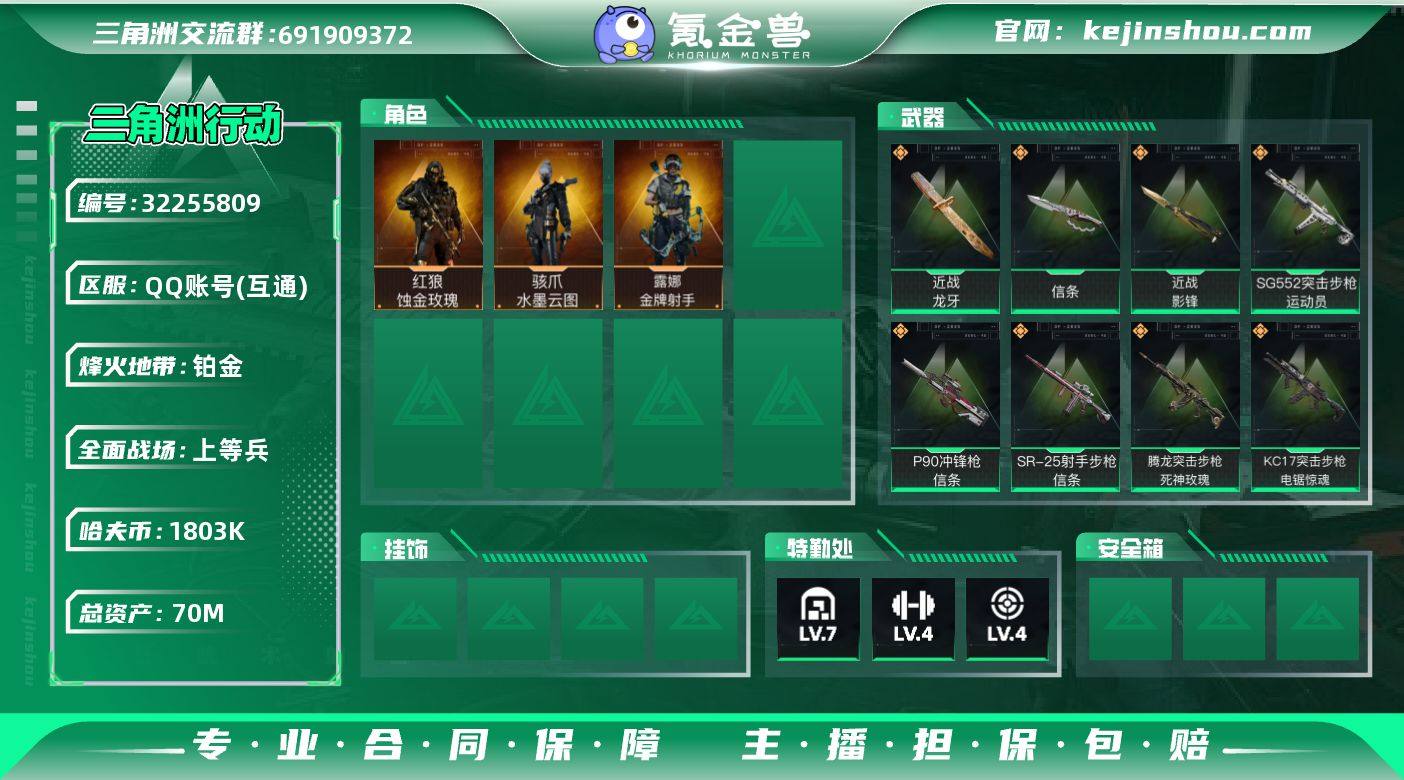 编号98174 不可二次等级60 总资产70M 流动资产49.6M 哈夫币1803k 2红皮 3刀皮 s8高级安全箱 仓库lv7 训练中心lv4 靶场lv4 蚀金玫瑰 水墨云图 近战武器-信条 近战武器-龙牙 近战武器-影锋