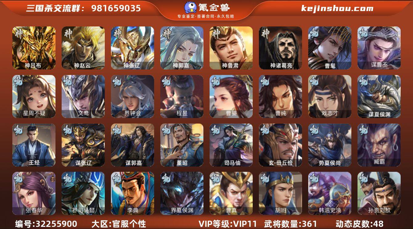 VIP等级: VIP11 官阶: 大将军 武将数量: 440 动态皮肤数量: 49 神将: 神甘宁,神刘备,神陆逊,神吕布,神张辽,神赵云,神吕蒙,神周瑜,神鲁肃 魏国武将: 刘晔,戏志才,曹纯,陈琳,程昱,郝昭,嵇康,界于禁,界钟会,魏-司马昭,王凌,王元姬,文鸯,杨修,王粲,张辽,SP蔡文姬,SP曹仁,SP关羽,SP贾诩,SP姜维,SP庞德,卞夫人,蔡贞姬,曹昂,曹操,曹冲,曹洪,曹丕,曹仁,曹叡,王异,张恭,鲁芝,界满宠,曹休,界曹植,满宠,荀攸,王基,钟繇,蒯越蒯良,郭嘉,牵招,荀彧,杜畿,界郭嘉,崔琰,界曹丕,界荀彧,朱灵,界甄姬,辛毗,吕虔,界陈群,界王异,界许褚,界郭淮,华歆,陈群,界邓艾,界典韦,界曹休,谋甄姬,司马孚,袁涣,李通,乐进,辛宪英,郭淮,毛玠,界曹彰,郭皇后,毌丘俭,夏侯惇,曹植,司马朗,谋于禁,界曹操,星周不疑,许褚,界张辽,谋徐晃,张郃,钟会,文聘,曹彰,界夏侯惇,诸葛诞,司马懿,甄姬,杨阜,界徐晃,徐晃,界曹仁,孙资刘放,韩浩史涣,胡班,曹真,谋曹丕,典韦,界夏侯渊,夏侯渊,李典,于禁,王双,邓艾,界司马懿,张春华,臧霸,牛金,朱灵(国战),曹髦,李昭焦伯,清河公主,司马伷,董昭,谋夏侯渊 蜀国武将: 关索,花鬘,界黄忠,谯周,沙摩柯,王平,张星彩,赵襄,周群,诸葛瞻,谋马超,谋赵云,马云騄,谋黄月英,徐庶,界魏延,杨仪,吕凯,界关羽,界诸葛亮,邓芝,界伊籍,胡金定,费祎,严颜,界黄月英,界张嶷,赵云,张松,彭羕,李丰,界刘备,界刘禅,刘封,糜竺,李遗,谋庞统,黄月英,关羽,吴懿,界廖化,向宠,祝融,张飞,黄皓,陈震,魏延,界周仓,马忠,界法正,糜夫人,界孟获,刘禅,界赵云,界姜维,张翼,关银屏,界祝融,SP孙尚香,SP徐庶,卧龙诸葛,宗预,周仓,简雍,界关兴张苞,诸葛亮,孙乾,界张飞,界卧龙诸葛,法正,界简雍,赵统赵广,陈到,界马岱,关平,马岱,界庞统,庞统,诸葛果,谋张飞,马谡,马超,霍峻,来敏,廖化,关兴张苞,孟获,秦宓,吴苋,夏侯氏,姜维,黄忠,刘备,界马超,李严,马良,傅肜,蒋琬费祎,刘谌,彭羕(国战)...
