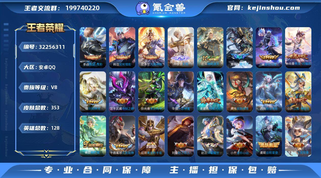 贵族8/皮肤353/典藏3/传说21/史诗98/英雄128/刘禅全皮/孙权全皮/戈娅全皮/空空儿全皮/影全皮/鸣剑·曳影/九霄神辉/弑枪猎影/无相/神树通天/鸣野蒿/夏侯惇霜北刀/典韦战鼓燎原/乘龙·问璇玑/澜逐花归海/山海·琳琅生/淬星耀世/游龙清影/音你心动-小乔/飞鸢探春/时雨天司/炽阳神光/启明星使/一念神魔/时之恋人-刘备/黄金白羊座/久胜战神/黄金射手座/末日机甲-孙尚香/地狱之眼/埋骨钱/蔡文姬夏日便利店/虞姬夏日便利店/天穹之誓(s36)/阴阳师/皇家上将/蔷薇恋人/迷踪丽影/王者之锤/超时空战士-钟无艳/奇幻香踪/猎兽之王/无心/游园惊梦/落雪兰心/魔术师/海滩派对/傲雪梅枪/午后时光/金庭之子(s27)/至尊宝/孙行者/辉光之辰/圣弓游侠/云中旅人(s29)/潮玩骑兵/黎明之约/五谷丰年/原初追遂者/顽趣-梦奇/大漠名商(s28)/李小龙/擒涛扼浪(s31)/电玩高手/纤云弄巧/暖冬·兔眠/玲珑珍味/探海日志(s32)/海盐诗旅(s30)/星界游侠/驭风魔法/女武神/流音漫舞/地狱燃心/江河有灵/古海寻踪(s33)/百解令(蒙犽)/蒙恬荣光圣徽/高渐离燃音魔法/妲己灵卜魔法/鬼谷子天穹祈灯(S34)/龙武盛年/蔬乡物语(鲁班七号)/蔬乡物语(李元芳)/剑破天穹(s35)/程咬金群星魔术团/青焰无极/苍威无极/刘备异域游侠/熔金海岸/噬灭天穹(s37)/谧流熔炉/虚灵犬护/逆浪荇歌/荣光之誓/星界战将/九幽镇关/破空之剑/神迹守卫/百相守梦-百里守约/百相守梦-老夫子/茶境仙/访茗客/鸭鸭历险记-刘禅/鸭鸭历险记-沈梦溪/线条小狗-周瑜/线条小狗-小乔/钟馗锁墨魂/罗小黑战记/石田雨龙/灵蛊蚀心/星界特工/怒海争锋/电玩·爆裂旋风/唤灵魅影/永昼/暗渊魔法/时之奇旅-安琪拉/乐园奇幻夜/天秀·启明/诗语江南/时之恋人-孙尚香/神威/修罗/魅语/青蛇/白蛇/鹰眼统帅/箭羽风息/猫狗日记-大乔/猫狗日记-孙策/节奏热浪/星夜王子/功夫厨神/逐浪之夏/天才门将/舞动绿茵/曙光守护者/特工魅影/心灵...