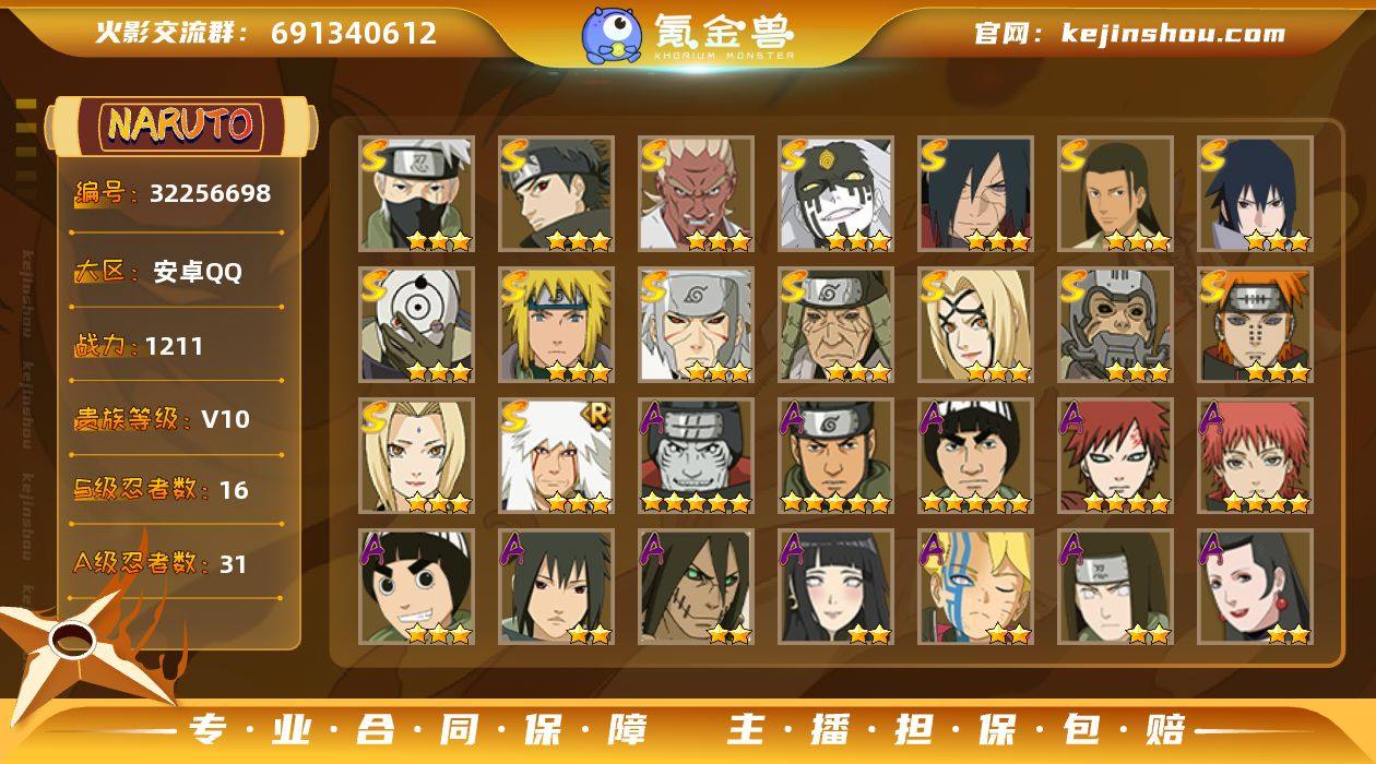 【编号47287可秒换绑】店长推荐特价处理精品号16S级忍者数-31A级忍者数 【S级忍者】:半藏「秽土转生」(3星),猿飞日斩「秽土转生」(3星),千手扉间「秽土转生」(3星),宇智波斑「秽土转生·解」(3星),艾「忍界大战」(3星),宇智波止水「须佐能乎」(3星),旗木卡卡西「须佐能乎」(3星),千手柱间「木叶创立」(3星),自来也「舞之豪杰」(3星),纲手(3星),纲手「百豪」(3星),波风水门(3星),佩恩「天道」(3星),宇智波佐助「永恒万花筒」(3星),宇智波斑 「白面具」(3星宇智波斑「白面具」),大筒木桃式(3星) 【A级忍者】:迪达拉(2星),迪达拉「秽土转生」(2星),大蛇丸「晓」(2星),飞段(2星),飞段「死司凭血」(2星),干柿鬼鲛(5星),漩涡博人「桃式显现」(2星),漩涡鸣人「仙人模式」(2星),漩涡鸣人「九尾查克拉」(2星),迈特凯(5星),旗木卡卡西「万花筒写轮眼」(2星),我爱罗「疾风传」(4星),我爱罗「忍界大战」(2星),蝎(4星),角都「地怨虞」(2星),角都「秽土转生」(2星),猿飞阿斯玛(5星),宇智波止水(2星),宇智波鼬(2星),药师兜「半蛇斗篷」(2星),照美冥「五代目水影」(2星),日向宁次「忍界大战」(2星),日向雏田「最终章」(2星),长十郎「六代目水影」(2星)...
