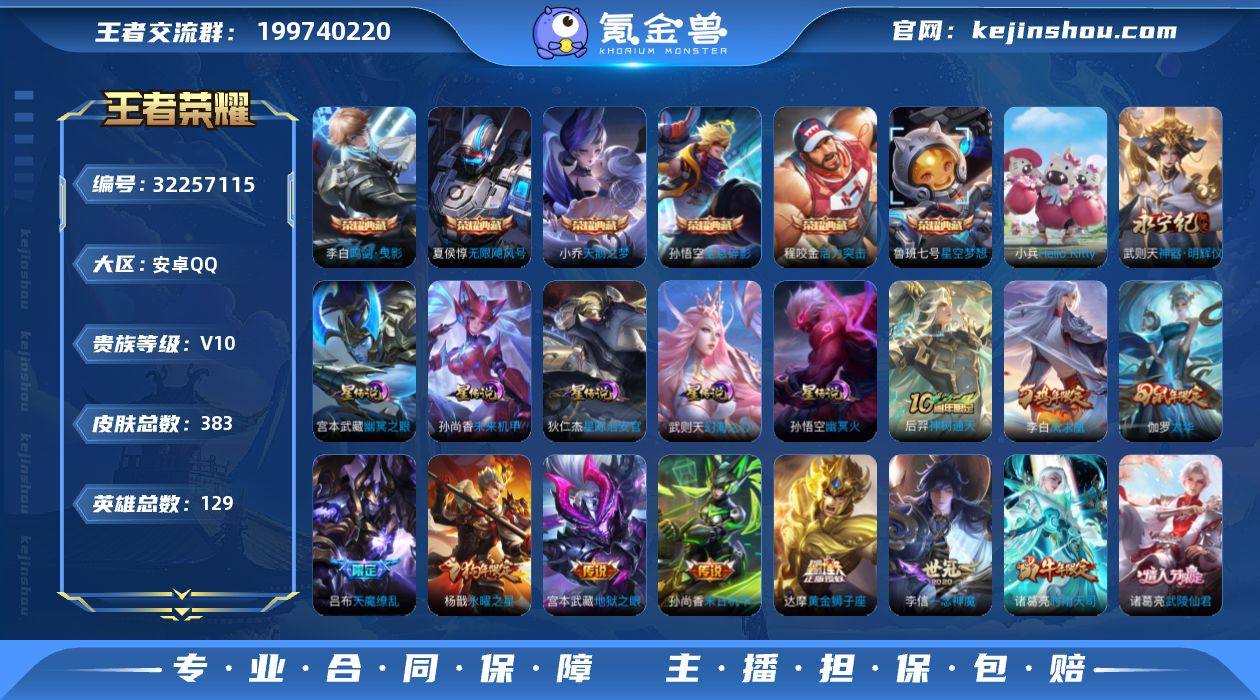 【高性价比V10·7典藏·天鹅之梦·鸣剑曳影·神器明辉仪·小兵Hello Kitty·武圣·时雨天司·太华·一念神魔·永曜之星·武陵仙君·凤求凰·可二次】YXw17759-安卓Q-129英雄-383皮肤-22王者印记-300铭文-贵族积分24w【贵族10】【7典藏·1无双·6星传说·27传说·5按键·373个性戳戳】【因赛季更新游戏段付以上号为准!】 【英雄全皮】:孙权全皮,敖隐全皮,空空儿全皮,影全皮 【荣耀典藏】:武则天英雄,孙悟空全息碎影,夏侯惇无限飓风号,小乔天鹅之梦,鲁班七号星空梦想,程咬金活力突击,李白鸣剑曳影 【无双皮肤】:武则天神器明辉仪 【星元皮肤】:狄仁杰星际治安官,刘备时之思念,孙尚香未来机甲,武则天幻海之心,孙悟空幽冥火,宫本武藏幽冥之眼 【小兵皮肤】:小兵Hello Kitty 【传说皮肤】:后羿神树通天,艾琳觅芳踪,周瑜音你心动,诸葛亮时雨天司,铠绛天战甲,虞姬启明星使,孙悟空零号赤焰,关羽武圣,李信一念神魔,刘备时之恋人,伽罗太华,貂蝉猫影幻舞,张良黄金白羊座,干将莫邪久胜战神,虞姬云霓雀翎,达摩黄金狮子座,花木兰冠军飞将,后羿黄金射手座,杨戬永曜之星,诸葛亮武陵仙君,李白凤求凰,孙尚香末日机甲,宫本武藏地狱之眼,孙悟空地狱火,吕布天魔缭乱,武则天海洋之心,狄仁杰超时空战士 【限定皮肤】:白起狰,狄仁杰阴阳师,虞姬凯尔特女王,赵云皇家上将,墨子神迹守卫,妲己热情桑巴,嬴政白昼王子,鲁班七号狮舞东方,鲁班七号乒乒小将,庄周蜃楼王,高渐离死亡摇滚,高渐离玩趣恶龙,阿轲迷踪丽影,钟无艳王者之锤,孙膑妖精王,扁鹊炼金王,扁鹊奇幻香踪,芈月重明,吕布天魔缭乱,吕布猎兽之王,周瑜赤莲之焰,元歌云间偶戏,夏侯惇朔风刀,甄姬游园惊梦,曹操烛龙,曹操天狼征服者,典韦穷奇,典韦蓝屏警告,典韦岱宗,马可波罗暗影游猎,狄仁杰魔术师,狄仁杰万华元夜,达摩星际陆战...