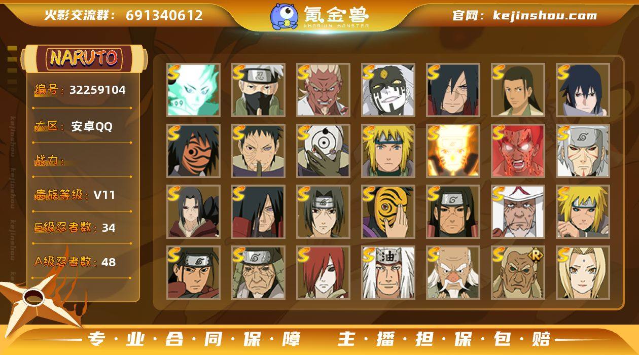 B653385 【1425w战力/34S+48A/熊猫+蛞蝓+猛犸象/秽土水门+神秘面具男+白面具+忍战带土+秽土柱+秽土解斑+秽土长门+十尾带土+红夜面具+最终章舍人+九喇嘛鸣人+忍战樱+须佐卡卡西+死门凯/新春止水+漂泊扉间+侠隐兜+漂泊佩恩+漂泊小南+新春鼬+暴怒带土带皮】 战力1425w S忍者数量34 A忍者数量48 VIP等级【文本】V11 通灵兽数21 【可二次实名】 【永久包赔】 【V11】 【无防沉迷】 S级忍者32 A级忍者34 S级忍者:天道佩恩,秽土转生解宇智波斑,舞之豪杰自来也,秽土转生波风水门,秽土转生猿飞日斩,须佐能乎宇智波鼬,忍界大战宇智波带土,忍界大战大野木,九喇嘛连结漩涡鸣人,忍界大战春野樱,红夜之刃神秘面具男,大蛇丸,波风水门(普通),木叶创立千手柱间,秽土转生千手扉间,秽土转生千手柱间,死门迈特凯,须佐能乎卡卡西,三代目雷影艾,秽土转生长门,千手柱间(普通),猿飞日斩(普通),纲手(普通),自来也(普通),秽土转生宇智波鼬,大筒木舍人,忍界大战艾,神秘面具男(普通),永恒万花筒宇智波佐助,大筒木桃式,秽土转生宇智波斑,白面具宇智波斑; A级忍者:不风,秽土转生迪达拉,死司凭血飞段,忍界大战奇拉比,五代目雷影达鲁伊,青年艾,漂泊浪客佩恩六道,六代目水影长十郎,桃式显现漩涡博人,最终章日向雏田,忍界大战李洛克,漂泊武士千手扉间,青年长门,漂泊浪客小南,秽土转生角都,幻之真容旗木卡卡西,绯流琥_蝎,须佐能乎宇智波佐助,五代目水影照美冥,万花筒写轮眼宇智波佐助,志村团藏,绯流琥_蝎,桃地再不斩,忍界大战日向宁次,侠隐江湖药师兜,新春限定宇智波止水,四代目土影黑土,暴怒宇智波带土,新春限定宇智波鼬,青年波风水门,九尾查克拉漩涡鸣人,近松十人卫千代,忍界大战秋道丁次,仙人模式漩涡鸣人;