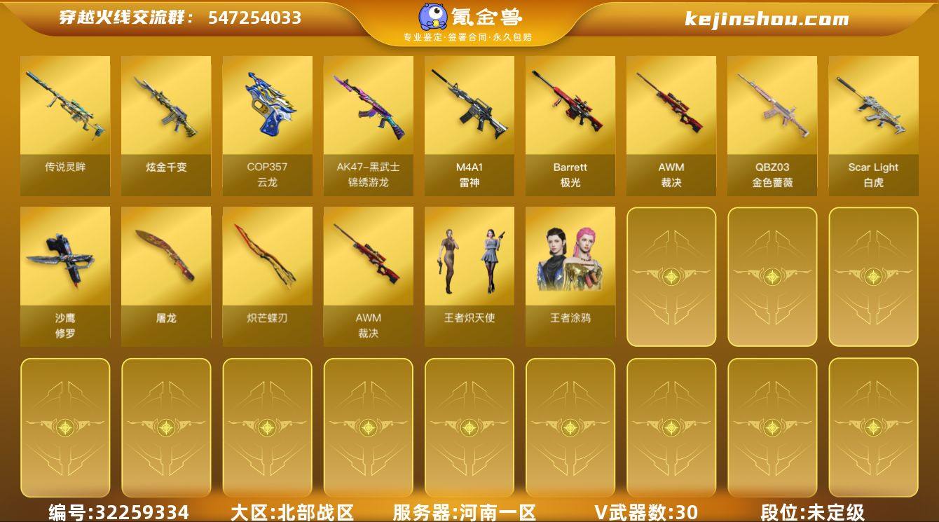 河南一区-32V-1王者-1炫金 【传说武器】:传说灵眸 【热门武器】:传说灵眸,QBZ03-金色蔷薇,Scar Light-白虎,羊驼玩偶,沙鹰-修罗*4,炽芒蝶刃 【王者炫金武器】:炫金千变 【音效卡】:修罗-云海游龙音效卡 【皮肤】:裁决-羽掣 皮肤,雷神-航星皮肤,雷神-源计划2.0专属 皮肤 【角色】:战地猎狐,王者涂鸦,奇洋探员,修道士,云海玲珑,炽天使,芳心审判者,娟娟,灵狐者-黄金海岸,龙儿,潘多拉-X,蛇姬,铁骑荣耀,游珑儿,智影 【人偶武器】:Scar Light-马枪,生化手雷-机甲核心,巴雷特-赏金猎人,烟雾弹-迷雾幽灵 【暴走生化】:超级对讲机 【挑战大师】:激光毁灭者III-白马银枪 【英雄级武器】:M4A1-雷神*3,Scar Light-白虎,黑武士-锦绣游龙,QBZ03-金色蔷薇,王者芳薇-觉醒版,Barrett-极光,AWM-裁决,沙鹰-修罗*4,COP 357-云龙*2,屠龙,炽芒蝶刃,高爆手雷-幻灵*3,手雷-热带奇洋,闪光弹-幻灵,闪光弹-云龙*2,烟雾弹-幻灵*3,M4A1-赤狱骑士 【道具】:BS战队炫彩背包,CFPL炫彩背包,云山科技背包,亚洲杯纪念炫彩背包,古蛇迷踪炫彩背包,奇洋探员-海龟背包,炫彩背包-诺拉,超级背包,女皇终结者-魔龙之吻,救世主-黑桃战神,绿色巨人,灵魂忍者*3,变异宝贝,妖姬,迷雾幽灵*3,生化弹匣,夺命之镰,防化服*3,金色流光-枪王排位,星辰流光-枪王排位,枪王排位28赛季金色流光,枪王排位29赛季金色流光,C4-再燃火线,防弹头盔*3,防弹衣*3,C4工具钳*3,手雷包*3 【特殊枪械】:1白虎