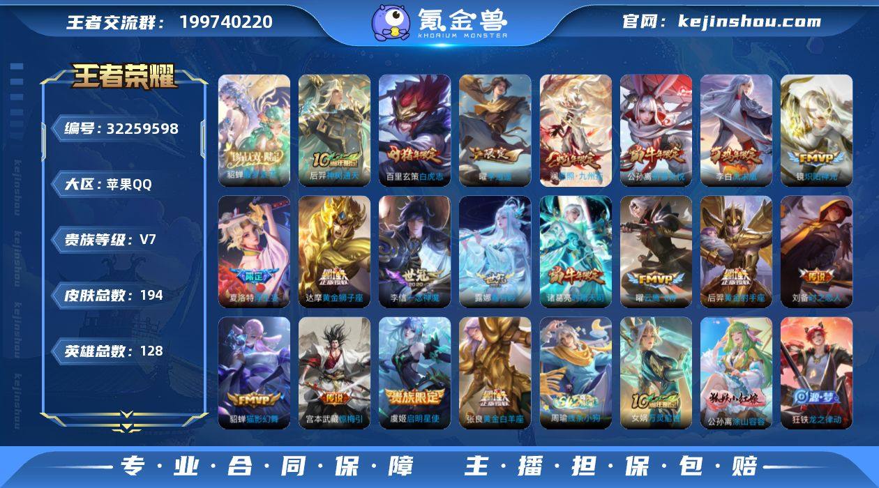 苹果Q-V7-至尊星耀V段位-128英雄-194皮肤-1珍品无双-19传说-44史诗 【珍品无双】:貂蝉馥梦繁花 【传说皮肤】:后羿神树通天,澜愿照九州拓,露娜霜月吟,宫本武藏惊梅引,夏洛特浮生妄,曜李逍遥 ,公孙离祈雪灵祝,诸葛亮时雨天司,镜炽阳神光,虞姬启明星使,曜云鹰飞将,李信一念神魔,刘备时之恋人,貂蝉猫影幻舞,张良黄金白羊座,达摩黄金狮子座,百里玄策白虎志,后羿黄金射手座,李白凤求凰 【限定皮肤】:狄仁杰阴阳师,赵云皇家上将,鲁班七号狮舞东方,阿轲迷踪丽影,周瑜赤莲之焰,夏侯惇朔风刀,马可波罗暗影游猎,狄仁杰魔术师,狄仁杰万华元夜,达摩沙漠行僧,项羽海滩派对,老夫子醍醐杖,程咬金演武夺筹,露娜一生所爱,刘邦夺宝奇兵,韩信飞衡,兰陵王驯魔猎人,兰陵王金庭之子,李元芳银河之约,李元芳云中旅人,虞姬启明星使,钟馗神迹守卫,钟馗驱傩正仪,蔡文姬繁星吟游,鬼谷子原初探秘者,诸葛亮时雨天司,苏烈千军破阵,百里玄策白虎志,百里玄策原初追逐者,弈星混沌棋,公孙离祈雪灵祝,沈梦溪星空之诺,沈梦溪大漠名商,明世隐疑决卦,裴擒虎擒涛扼浪,云中君纤云弄巧,盾山御銮,猪八戒西部大镖客,上官婉儿梁祝,上官婉儿天狼绘梦者,嫦娥拒霜思,曜李逍遥 ,鲁班大师探海日志,桑启海盐诗旅,夏洛特浮生妄,张良古海寻踪,蒙犽百解令,鬼谷子天穹祈灯 【年限皮肤】:李白凤求凰,百里玄策白虎志,韩信飞衡,公孙离祈雪灵祝,诸葛亮时雨天司,澜愿照九州拓 【赛季限定】:盾山御銮,夏侯惇朔风刀,弈星混沌棋,明世隐疑决卦,老夫子醍醐杖,鬼谷子原初探秘者,狄仁杰万华元夜,程咬金演武夺筹,钟馗驱傩正仪,苏烈千军破阵,达摩沙漠行僧,兰陵王金庭之子,沈梦溪大漠名商,李元芳云中旅人,桑启海盐诗旅,裴擒虎擒涛扼浪,鲁班大师探海日志,张良古海寻踪,鬼谷子天穹祈灯,太乙...