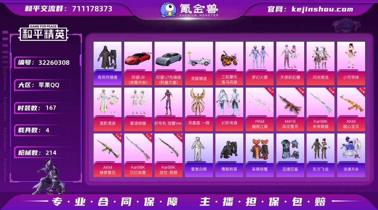 【秒换绑】苹果 手Q-9粉装-7特效枪-4载具-4粉色飞行器-69667热力值-5王牌印记-167套装-214枪皮 【热门品类】:粉装-梦幻火箭,套装-浪漫天命,套装-小丑鱼,套装-奇异狩猎者,套装-金羽特工,套装-龟仙人,套装-粉红小猪,角色-8号机,角色-Mark.06,大砍刀-青龙偃月刀,撬棍-龙胆亮银枪,熔岩游骑兵连帽夹克 【粉色套装】:粉装-天使彩虹糖,粉装-梦幻火箭,粉装-闪光银龙,角色-小可学妹,粉装-莲影清波,粉装-蜜语绒猫,角色-初号机 觉醒Ver.,角色-凤凰座 一辉,粉装-幻彩电音 【粉色枪皮等级】:AKM-甜心宝贝(五级),AKM-绿萝繁花(五级),M416-风花雪月(六级),Kar98K-未来歌姬(六级),Kar98K-创世·救赎(二级),Kar98K-巳巳如意(三级),PKM-江南烟雨(七级) 【粉色载具】:仰望U9(赤霞丹朱),仰望U7(阿盖尔紫),灵鼠银迹,鬼马风驰 【粉色枪皮】:AKM-甜心宝贝,AKM-绿萝繁花,M416-风花雪月,Kar98K-未来歌姬,Kar98K-创世·救赎,Kar98K-巳巳如意,PKM-江南烟雨 【粉色飞行器】:齐天大圣飞行器,拂晓神骑飞行器,繁龙极客飞行器,星空武士飞行器 【粉色降落伞】:春暖花开降落伞,神秘黑猫降落伞,阿狸红降落伞,怪笑疯兔降落伞,恐龙拽拽降落伞,暗夜鎏金降落伞,炫光之旅降落伞,彩装战姬降落伞,镜域双华降落伞,霓虹漫游降落伞,精灵梦叶罗丽降落伞,冠军兔兔降落伞,鸢尾晶梦降落伞,初号机 觉醒Ver.降落伞,雪月幻音降落伞,冷漠罗丽降落伞 【稀有套装】:套装-龟仙人,套装-雏菊兔兔,套装-萝兰蝴蝶,套装-紫幽梦,套装-蓝冰羽,套装-星影赞美诗,角色-夜瞳黯灵 【稀有枪皮】:AKM-影袭,AKM-破晓战魂,AKM-缤纷海域,AKM-萌趣颜团子,AKM-虎虎生威,AKM-阿狸红,AKM-龙的传人,M16A4-凝视深渊,M16A4-幻世战舞者,M16A4-快乐主宰,M16A4-甜心亚梦,M16A4-龙虾霸霸,SCAR-L-炫彩节奏,SCAR-L-玉...