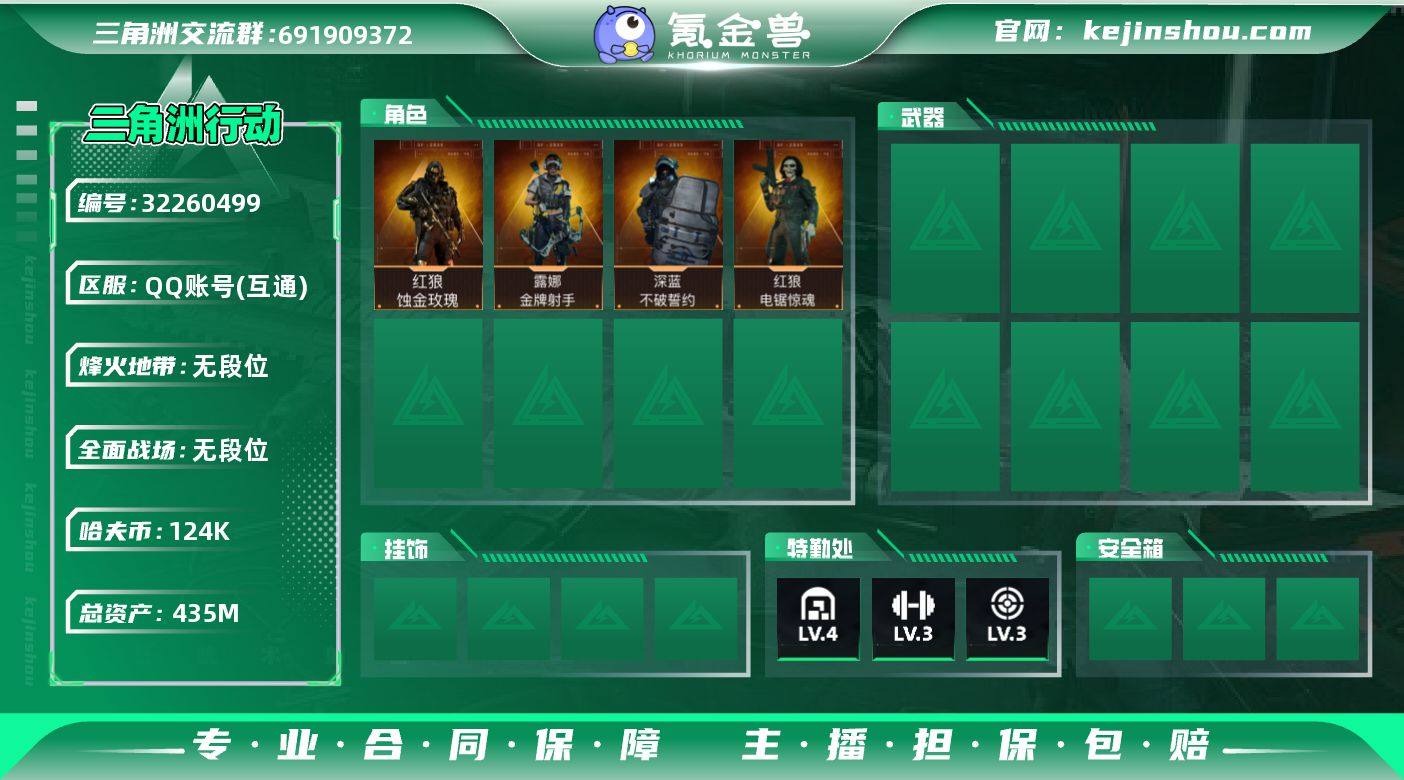 LJ4541总资产434.8M哈弗币124M无红狼蚀金玫瑰,深蓝不破誓约,红狼电锯惊魂,露娜金牌射手无无AW子弹95发三角币2493仓库LV.10基础安全箱靶场LV.7训练中心LV.7无,红狼-蚀金玫瑰,深蓝-不破誓约,红狼-电锯惊魂,露娜-金牌射手