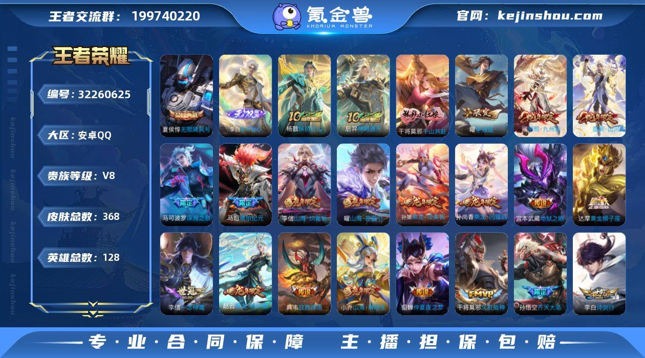 贵族等级:V8 典藏皮肤数:1 珍品无双皮肤数:0 无双皮肤数:1 珍品传说皮肤数:0 传说皮肤数:32 史诗皮肤数:110 皮肤数:368 英雄数:128 段位:星耀 卖家说:可以小刀
