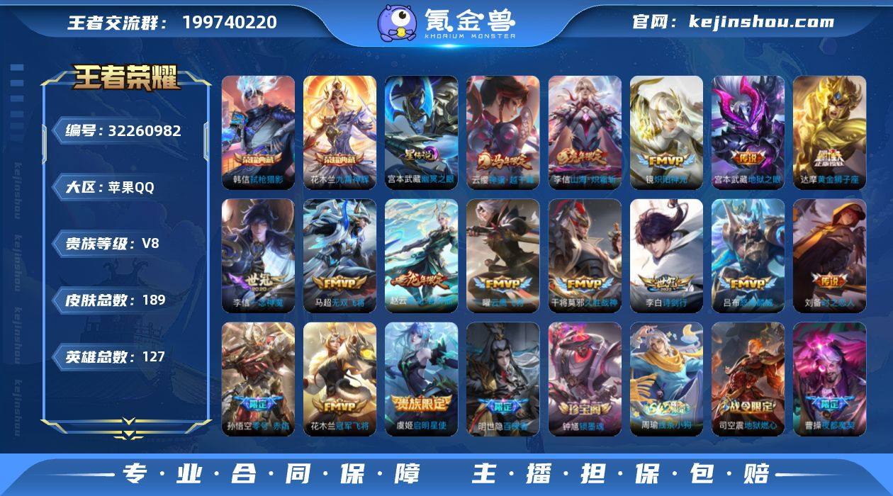 贵族等级:V8 典藏皮肤数:2 珍品无双皮肤数:0 无双皮肤数:0 珍品传说皮肤数:0 传说皮肤数:16 史诗皮肤数:43 皮肤数:189 英雄数:127 段位:荣耀王者 卖家说:2典藏传说精致