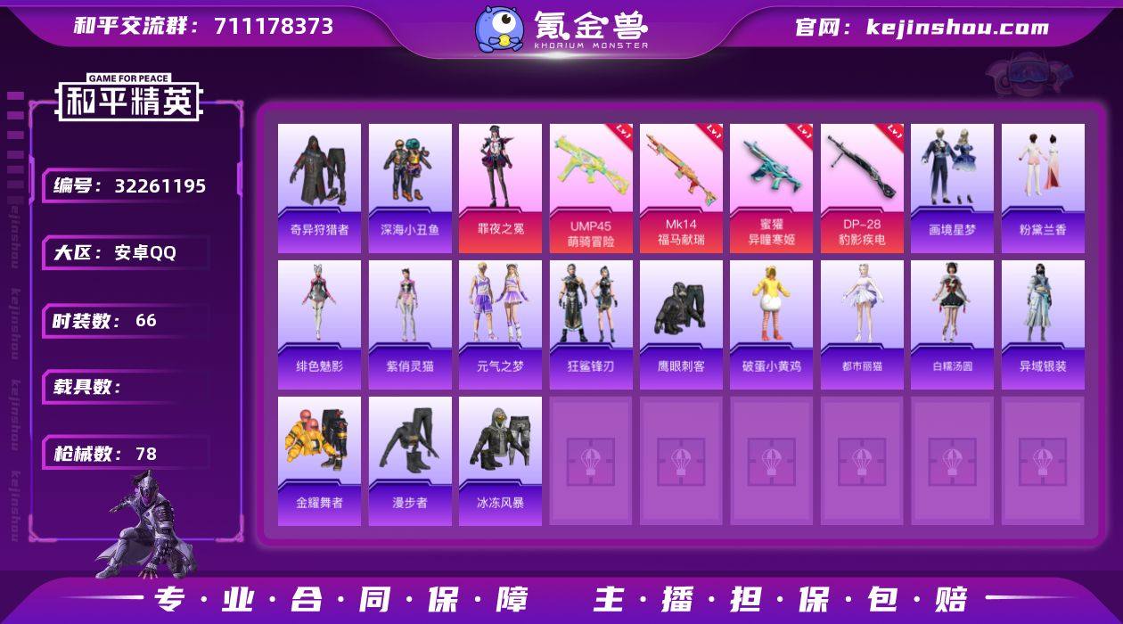 M1046849【身法号1粉装-4特效枪奇异狩猎者,深海小丑鱼】安卓手Q-1粉装-4特效枪-66套装-78枪皮-3王牌印记-荣耀皇冠Ⅳ-21458热力值【1粉装】角色-罪夜之冕【4特效枪】Mk14-福马献瑞[5级],DP-28-豹影疾电[5级],UMP45-萌骑冒险[2级],蜜獾-异瞳寒姬[4级]【7稀有】奇异狩猎者,深海小丑鱼,S686-奇异狩猎者,M24-奇异狩猎者,汤姆逊-奇异狩猎者,M762-奇异狩猎者,AKM-缤纷海域【8飞行器】绝对恒星飞行器,鸡智如我飞行器,炫彩糖果飞行器,狂鲨锋刃飞行器,异域银装飞行器,马上有福飞行器,登顶巅峰飞行器,极意拳锋飞行器【1头盔】幻影战神头盔【1背包】深海小丑鱼背包【132其它衣服和枪皮】黄色运动,马上有钱,破晓战魂,狙击之神,SS37特训,夏日倾情,SS34特训,雪国风尚,元气之梦,青翼流星,破蛋小黄鸡,擎苍青焰,贵族骑装,街头风暴,柠萌假日,完美偶像,冰冻风暴,元素星魂,红色运动,幻影武者,旭日情侣,朱霞炽焰,阳光火鸡,猛禽,炫彩糖果,午间小调,角色-绯色魅影,白色伏地魔,幻世保卫者,特训学院,竞技名士,狂鲨锋刃,琴音绮想,异域银装,错位像素,长空猛禽,海岛探路者,画境星梦,绮丽涂鸦,金耀舞者,漫步者,SS36特训,白糯汤圆,角色-都市丽猫,风迹短诗,黑色伏地魔,凌霄紫焰,书海巡游,阳光菠萝,湖蓝色名流,角色-紫俏灵猫,蓝调潮人,荧光像素,薄荷星砂,萌鸡速递,鹰眼刺客,粉黛兰香,SS35特训,秘语星愿,蓝色运动,猎鹰,魅力单车,蓝彩潮人,突击盾牌-绝对恒星,Famas-霓彩脉冲,AUG-紫晶流影,SVD-霓彩脉冲,DBS-风迹短诗,P92-凌霄紫焰,UZI-炫彩糖果,JS9-凌霄紫焰,AKM-霓彩脉冲,Mini14-穿刺龙虾,平底锅-画境星梦,汤姆逊-像素花束,MP5K-画境星梦,燃烧瓶-福马献瑞,Mk14-薄荷星砂,蜜獾-风迹短诗,PKM-荧光像素,AUG-冰晶雪宝,GROZA-福马献瑞,UZI-影袭,汤姆逊-错位像素,M416-错位像素,12-风迹短诗,M1加兰德-画境星梦,UMP45-夜灯,GRO