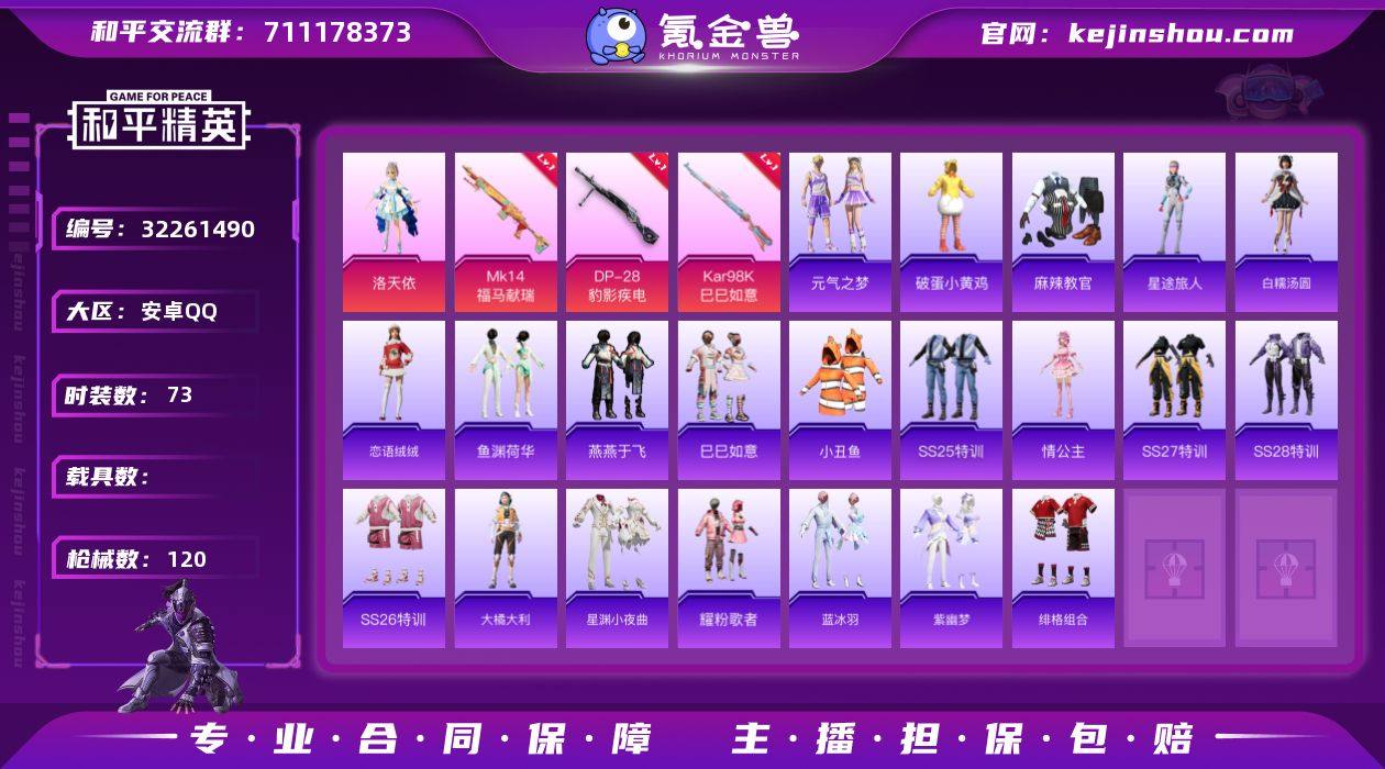 M1046848【地铁满天赋可二次1粉装-3特效枪 洛天依 小丑鱼】安卓手Q-1粉装-3特效枪-73套装-120枪皮-6王牌印记-荣耀皇冠Ⅳ-29618热力值【1粉装】角色-洛天依【3特效枪】Mk14-福马献瑞[5级],DP-28-豹影疾电[5级],Kar98K-巳巳如意[5级]【1稀有】小丑鱼【5飞行器】破刃行动尾迹,空岛之星尾迹,顶峰精英尾迹,鸡智如我飞行器,异域银装飞行器【188其它衣服和枪皮】战术大师,狙击之神,黄色伏地魔,长空猛禽,薄荷星砂,猎鹰,龙的传人,SS31特训,SS32特训,街头潮人,冷焰舞者,海盐绵绵冰,科技之星,SS20特训,萌鸡速递,福马献瑞,麻辣教官,朱霞炽焰,湖蓝色名流,春日漫步,星途旅人,魅力单车,大橘大利,SS28特训,凌霄紫焰,鱼渊荷华,元气之梦,SS35特训,竞技名士,耀粉歌者,蓝彩潮人,破蛋小黄鸡,巳巳如意,SS25特训,香桃花海,SS37特训,耀眼新星,王牌教练,SS27特训,光之冒险,战地督导,猛禽,黑色伏地魔,竞技达人朋克,柠萌假日,星渊小夜曲,莱茵河畔,蓝冰羽,缤纷果语,幻世战舞者,燕燕于飞,SS21特训,绯格组合,元素星魂,白糯汤圆,SS22特训,SS34特训,角色-情公主,都市魅力,老实芭蕉,黄色运动,SS23特训,SS26特训,恋语绒绒,龙魂突击队,紫幽梦,幻影武者,云魄琉璃,SS36特训,特训学院,空岛之星,SCAR-L-海盐豹豹,AWM-垂柳戏鸭,Vector-生命誓言,十字弩-异域银装,P92-凌霄紫焰,M24-蓝晶绮麟,S1897-紫幽梦,S12K-霓彩脉冲,ACE32-冰晶雪宝,UZI-炫彩糖果,汤姆逊-天降萌叽,PKM-紫幽梦,Vector-燕燕于飞,UMP45-海盐豹豹,Mk14-冰河战士,SCAR-L-星途旅人,G36C-星穹咏叹调,UZI-冰河战士,信号枪-异瞳寒姬,MG3-乌木金纹,蝎式手枪-燕燕于飞,M16A4-冰河战士,GROZA-守护天翼,P90-巳巳如意,GROZA-福马献瑞,M416-蓝色火焰,Kar98K-红色方程式,AUG-青春冒险家,M16A4-红色方程式,SP