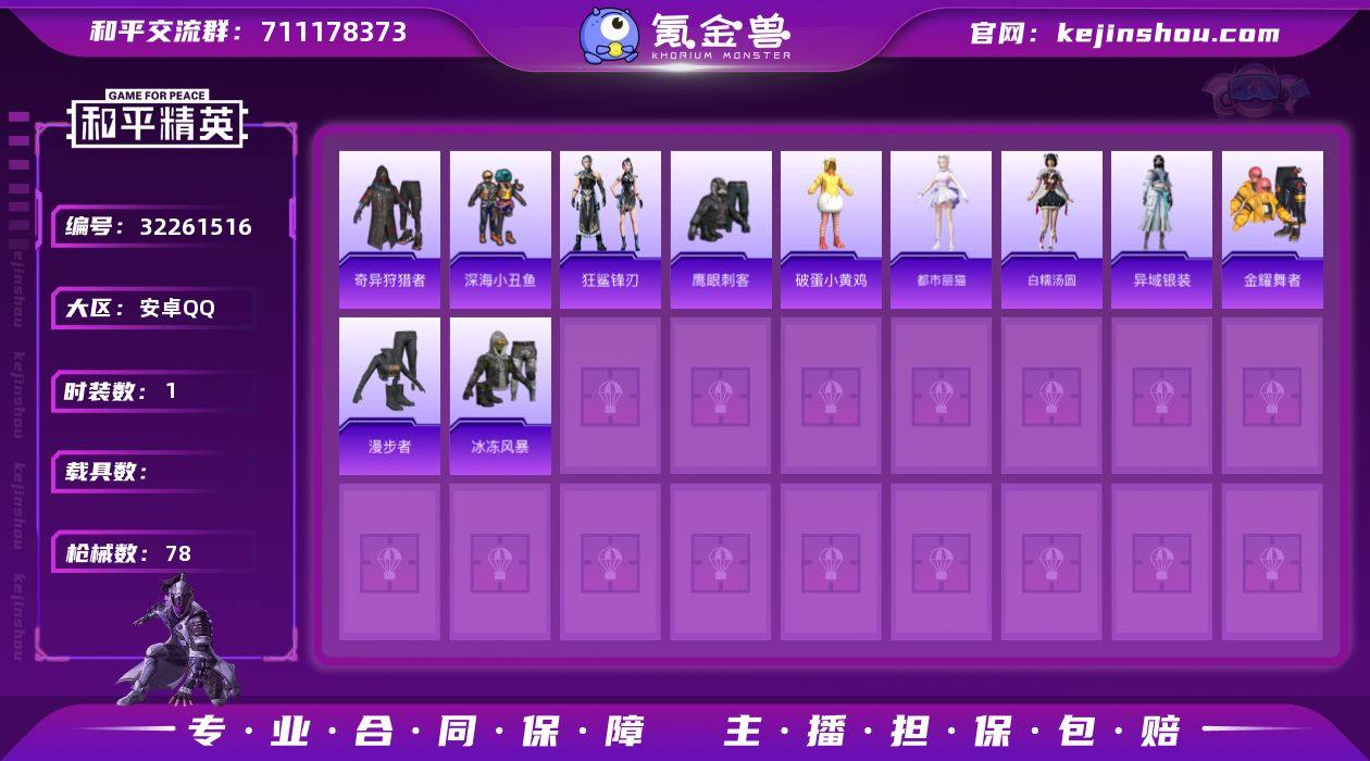 M1046849【身法号1粉装-4特效枪奇异狩猎者,深海小丑鱼】安卓手Q-1粉装-4特效枪-66套装-78枪皮-3王牌印记-荣耀皇冠Ⅳ-21458热力值【1粉装】角色-罪夜之冕【4特效枪】Mk14-福马献瑞[5级],DP-28-豹影疾电[5级],UMP45-萌骑冒险[2级],蜜獾-异瞳寒姬[4级]【7稀有】奇异狩猎者,深海小丑鱼,S686-奇异狩猎者,M24-奇异狩猎者,汤姆逊-奇异狩猎者,M762-奇异狩猎者,AKM-缤纷海域【8飞行器】绝对恒星飞行器,鸡智如我飞行器,炫彩糖果飞行器,狂鲨锋刃飞行器,异域银装飞行器,马上有福飞行器,登顶巅峰飞行器,极意拳锋飞行器【1头盔】幻影战神头盔【1背包】深海小丑鱼背包【132其它衣服和枪皮】黄色运动,马上有钱,破晓战魂,狙击之神,SS37特训,夏日倾情,SS34特训,雪国风尚,元气之梦,青翼流星,破蛋小黄鸡,擎苍青焰,贵族骑装,街头风暴,柠萌假日,完美偶像,冰冻风暴,元素星魂,红色运动,幻影武者,旭日情侣,朱霞炽焰,阳光火鸡,猛禽,炫彩糖果,午间小调,角色-绯色魅影,白色伏地魔,幻世保卫者,特训学院,竞技名士,狂鲨锋刃,琴音绮想,异域银装,错位像素,长空猛禽,海岛探路者,画境星梦,绮丽涂鸦,金耀舞者,漫步者,SS36特训,白糯汤圆,角色-都市丽猫,风迹短诗,黑色伏地魔,凌霄紫焰,书海巡游,阳光菠萝,湖蓝色名流,角色-紫俏灵猫,蓝调潮人,荧光像素,薄荷星砂,萌鸡速递,鹰眼刺客,粉黛兰香,SS35特训,秘语星愿,蓝色运动,猎鹰,魅力单车,蓝彩潮人,突击盾牌-绝对恒星,Famas-霓彩脉冲,AUG-紫晶流影,SVD-霓彩脉冲,DBS-风迹短诗,P92-凌霄紫焰,UZI-炫彩糖果,JS9-凌霄紫焰,AKM-霓彩脉冲,Mini14-穿刺龙虾,平底锅-画境星梦,汤姆逊-像素花束,MP5K-画境星梦,燃烧瓶-福马献瑞,Mk14-薄荷星砂,蜜獾-风迹短诗,PKM-荧光像素,AUG-冰晶雪宝,GROZA-福马献瑞,UZI-影袭,汤姆逊-错位像素,M416-错位像素,12-风迹短诗,M1加兰德-画境星梦,UMP45-夜灯,GRO