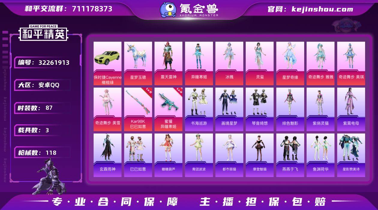 安卓 手Q-1神装-12粉装-6特效枪-3载具-8粉色飞行器-42836热力值-6王牌印记-87套装-118枪皮 【红色神装等级】:暮色玫影-艾丽娅(一级) 【红色角色神装】:暮色玫影-艾丽娅 【粉色套装】:角色-星梦奇缘,角色-奇迹舞步 雅雅,角色-奇迹舞步 美琪,角色-奇迹舞步 美雪,角色-冰魄,角色-灵玺,角色-异瞳寒姬,角色-震天雷神,角色-霁蓝缠春,角色-绛云霓裳,角色-辉光之愿,角色-虹云熊熊 【粉色枪皮等级】:AKM-暮色玫影(一级),蜜獾-异瞳寒姬(四级),AKS-74U-森灵之息(五级),Kar98K-巳巳如意(五级),Mk14-福马献瑞(一级),M417-绛云霓裳(五级) 【粉色载具】:保时捷Cayenne(橄榄绿),星梦玉骢,暮色幽蹄 【粉色枪皮】:AKM-暮色玫影,蜜獾-异瞳寒姬,AKS-74U-森灵之息,Kar98K-巳巳如意,Mk14-福马献瑞,M417-绛云霓裳 【粉色飞行器】:炫彩糖果飞行器,星梦奇缘飞行器,无垠阁飞行器,天象三御飞行器,极意拳锋飞行器,暮色之舞飞行器,绛云霓裳飞行器,辉光之愿飞行器 【粉色降落伞】:星梦奇缘降落伞,时空协奏降落伞,千金淑猫降落伞,幻海仙踪降落伞,奇迹舞步降落伞,无垠阁降落伞,异瞳寒姬降落伞,天象三御降落伞,炫彩糖果降落伞,霁蓝缠春降落伞,暮色玫影降落伞,绛云霓裳降落伞,辉光之愿降落伞,虹云熊熊降落伞 【稀有套装】:套装-巳巳如意,套装-雪国风尚,套装-炫彩糖果,套装-糖糖葫芦,套装-青团波波,角色-都市丽猫,角色-摩登魅猫,套装-燕燕于飞,套装-鱼渊荷华,套装-星影赞美诗,角色-绯色魅影,角色-紫俏灵猫,角色-紫霄电母,角色-玄霖雨神,套装-书海巡游,套装-画境星梦,套装-琴音绮想,角色-霜刃之御,角色-鎏光妙舞,角色-云韶流音,套装-雨过天青,套装-红釉青花 【稀有枪皮】:AUG-冰晶雪宝,M16A4-千金淑猫,SCAR-L-炫彩节奏,SCAR-L-玉兔迎春,SCAR-L-红色方程式,SCAR-L-天...