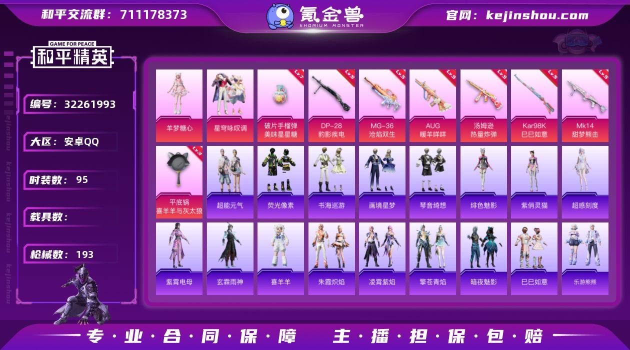 安卓 手Q-4粉装-11特效枪-0载具-2粉色飞行器-51197热力值-5王牌印记-95套装-193枪皮 【粉色套装】:粉装-星穹咏叹调,角色-羊梦糖心,角色-霁蓝缠春,角色-虎痴许褚 【粉色枪皮等级】:AUG-暖羊咩咩(五级),汤姆逊-热量炸弹(五级),AKS-74U-森灵之息(五级),Kar98K-巳巳如意(五级),Mk14-甜梦熊击(五级),Mk14-福马献瑞(五级),AA12-G-萌骑幻想(二级),DP-28-豹影疾电(五级),MG-36-沧焰双生(五级),平底锅-喜羊羊与灰太狼(三级),破片手榴弹-美味星星糖(七级) 【粉色枪皮】:AUG-暖羊咩咩,汤姆逊-热量炸弹,AKS-74U-森灵之息,Kar98K-巳巳如意,Mk14-甜梦熊击,Mk14-福马献瑞,AA12-G-萌骑幻想,DP-28-豹影疾电,MG-36-沧焰双生,平底锅-喜羊羊与灰太狼,破片手榴弹-美味星星糖 【粉色飞行器】:炫彩糖果飞行器,智趣喵喵飞行器 【粉色降落伞】:绝对恒星降落伞,春暖花开降落伞,洛神天依降落伞,萌物绒绒降落伞,千金淑猫降落伞,赛博古神降落伞,雪月幻音降落伞,绯果甜心降落伞,幻星舰长降落伞,幻彩电音降落伞,时光之吻降落伞,冷漠罗丽降落伞,智趣喵喵降落伞,无垠阁降落伞,异瞳寒姬降落伞,炫彩糖果降落伞 【稀有套装】:套装-巳巳如意,套装-乐游熊熊,套装-荒原牛仔,套装-超能元气,角色-超感刻度,套装-荧光像素,套装-雪国风尚,套装-炫彩糖果,套装-马上来财,套装-糖糖葫芦,套装-青团波波,套装-燕燕于飞,套装-鱼渊荷华,套装-粉恋花,套装-紫幽梦,套装-蓝冰羽,角色-瑰梦爱神,套装-星渊小夜曲,套装-极速光影,套装-彩虹兔,套装-云朵鹅,套装-雪绒豹,套装-蓝海鲸歌,角色-夜瞳黯灵,套装-朱霞炽焰,套装-凌霄紫焰,套装-擎苍青焰,玩偶服-喜羊羊,角色-绯色魅影,角色-紫俏灵猫,角色-紫霄电母,角色-玄霖雨神,套装-书海巡游,套装-画境星梦,套装-琴音绮想,角色-月烬之祷,套装-雨...