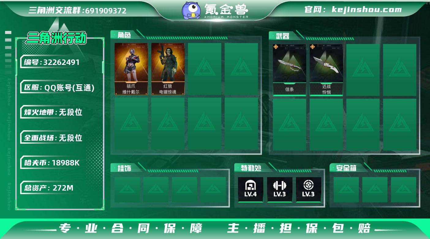 LJ5193总资产272.3M哈弗币18988K近战武器-怜悯,近战武器-信条,近战武器-黑鹰骇爪维什戴尔,红狼电锯惊魂无无AW子弹22发三角币179仓库LV.9进阶安全箱靶场LV.4训练中心LV.6无,骇爪-维什戴尔,红狼-电锯惊魂,近战-怜悯,近战-信条,近战-黑鹰