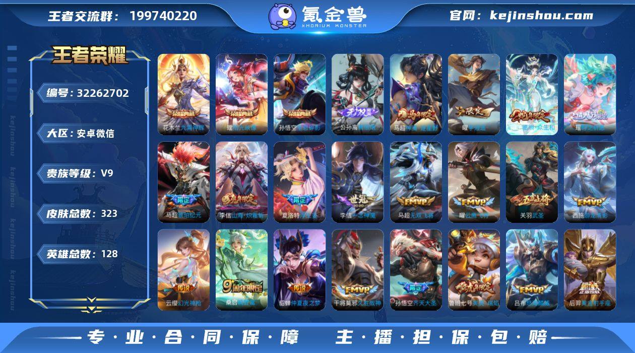 【AZW164】安卓WX-V9-最强王者段位-128英雄-323皮肤-3典藏皮肤-1无双-25传说-98史诗 【英雄全皮】:马超全皮,敖隐全皮,海诺全皮 【荣耀典藏】:孙悟空全息碎影,花木兰九霄神辉,瑶拾光映像 【无双皮肤】:公孙离离恨烟 【传说皮肤】:马超神骥逐星野,妲己愿照众生和,云缨幻光神枪,桑启鸣野蒿,马超琥珀纪元,夏洛特浮生妄,花木兰燃星之曲,孙悟空齐天大圣,李信山海炽霜斩,吕布怒海麟威,后羿无尽星芒,马超无双飞将,瑶时之祈愿,鲁班七号寅虎瑞焰,赵云淬星耀世,西施游龙清影,曜李逍遥 ,虞姬启明星使,孙悟空零号赤焰,关羽武圣,曜云鹰飞将,李信一念神魔,干将莫邪久胜战神,后羿黄金射手座,貂蝉仲夏夜之梦 【限定皮肤】:公孙离离恨烟,蔡文姬夏日便利店,虞姬夏日便利店,姜子牙天穹之誓,狄仁杰阴阳师,赵云皇家上将,赵云龙胆,孙尚香蔷薇恋人,鲁班七号寅虎瑞焰,庄周高山流水,高渐离死亡摇滚,钟无艳超时空战士,周瑜赤莲之焰,元歌云间偶戏,甄姬落雪兰心,马可波罗暗影游猎,狄仁杰魔术师,狄仁杰万华元夜,达摩沙漠行僧,项羽海滩派对,老夫子圣诞老人,老夫子醍醐杖,关羽武圣,程咬金演武夺筹,韩信逐梦之影,韩信飞衡,韩信傲雪梅枪,兰陵王金庭之子,花木兰瑞麟志,花木兰默契交锋,花木兰燃星之曲,亚瑟潮玩骑士王,孙悟空至尊宝,孙悟空大圣娶亲,孙悟空零号赤焰,孙悟空齐天大圣,后羿圣弓游侠,后羿无尽星芒,李元芳云中旅人,虞姬启明星使,钟馗驱傩正仪,干将莫邪真爱魔法,雅典娜黎明之约,鬼谷子原初探秘者,鬼谷子五谷丰年,铠青龙志,苏烈千军破阵,百里玄策原初追逐者,百里守约朱雀志,梦奇顽趣,沈梦溪大漠名商,裴擒虎李小龙,裴擒虎擒涛扼浪,瑶时之祈愿,李信山海炽霜斩,伽罗天狼溯光者,猪八戒西部大镖客,上官婉儿梁祝,上官婉儿神器万象笔,嫦娥拒霜思,嫦娥暖...