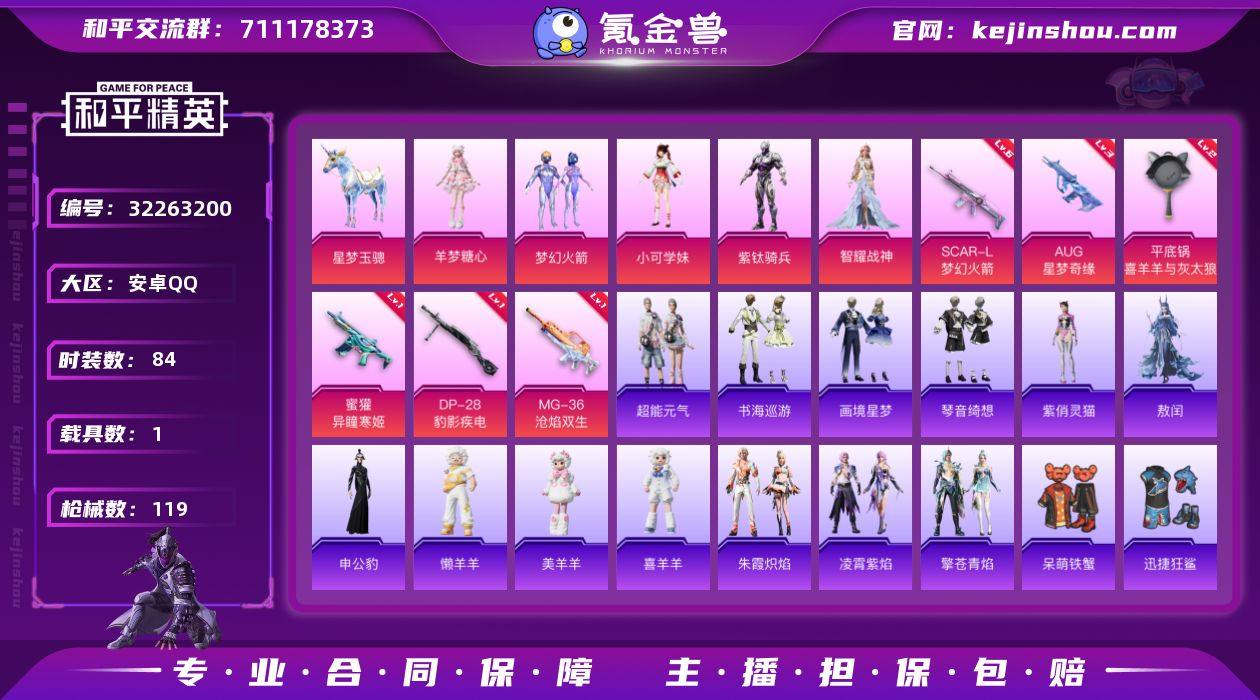 【kyhp969】安卓 手Q-6粉装-9特效枪-1载具-5粉色飞行器-35451热力值-3王牌印记-84套装-119枪皮 【热门品类】:粉装-梦幻火箭,套装-浪漫天命,角色-军刀雅典娜,套装-忍者信条,套装-暗影哥特 【粉色套装】:粉装-梦幻火箭,角色-小可学妹,角色-紫钛骑兵,角色-智耀战神,角色-羊梦糖心,角色-辉云木星 【粉色枪皮等级】:SCAR-L-梦幻火箭(六级),AUG-星梦奇缘(三级),蜜獾-异瞳寒姬(一级),AKS-74U-森灵之息(一级),Mk14-福马献瑞(一级),AA12-G-萌骑幻想(一级),DP-28-豹影疾电(一级),MG-36-沧焰双生(一级),平底锅-喜羊羊与灰太狼(二级) 【粉色载具】:星梦玉骢 【粉色枪皮】:SCAR-L-梦幻火箭,AUG-星梦奇缘,蜜獾-异瞳寒姬,AKS-74U-森灵之息,Mk14-福马献瑞,AA12-G-萌骑幻想,DP-28-豹影疾电,MG-36-沧焰双生,平底锅-喜羊羊与灰太狼 【粉色飞行器】:香车宝马飞行器,炫彩糖果飞行器,梦幻火箭飞行器,极意拳锋飞行器,暮色之舞飞行器 【粉色降落伞】:梦幻火箭降落伞,童趣迷兔降落伞,暗夜玫瑰降落伞,洛神天依降落伞,星梦奇缘降落伞,荧海星豚降落伞,绯穹魔姬降落伞,无垠阁降落伞,喜羊羊与灰太狼降落伞,异瞳寒姬降落伞,炫彩糖果降落伞 【稀有套装】:套装-绒宝小鹅,套装-超能元气,套装-雪国风尚,套装-炫彩糖果,套装-鱼渊荷华,套装-紫幽梦,套装-蓝冰羽,角色-瑰梦爱神,套装-诡诞巡游,角色-夜瞳黯灵,套装-朱霞炽焰,套装-凌霄紫焰,套装-擎苍青焰,玩偶服-懒羊羊,玩偶服-美羊羊,玩偶服-喜羊羊,角色-敖闰,角色-申公豹,角色-紫俏灵猫,套装-书海巡游,套装-画境星梦,套装-琴音绮想,套装-雨过天青,套装-红釉青花 【稀有枪皮】:AUG-冰晶雪宝,AKM-破晓战魂,SCAR-L-夜灯,SCAR-L-炫彩节奏,M416-萌萌史莱姆,M762-登顶巅峰,ACE32-画境星梦,ARX-凌霄紫焰,UZI-天降萌叽,UZI-影袭...