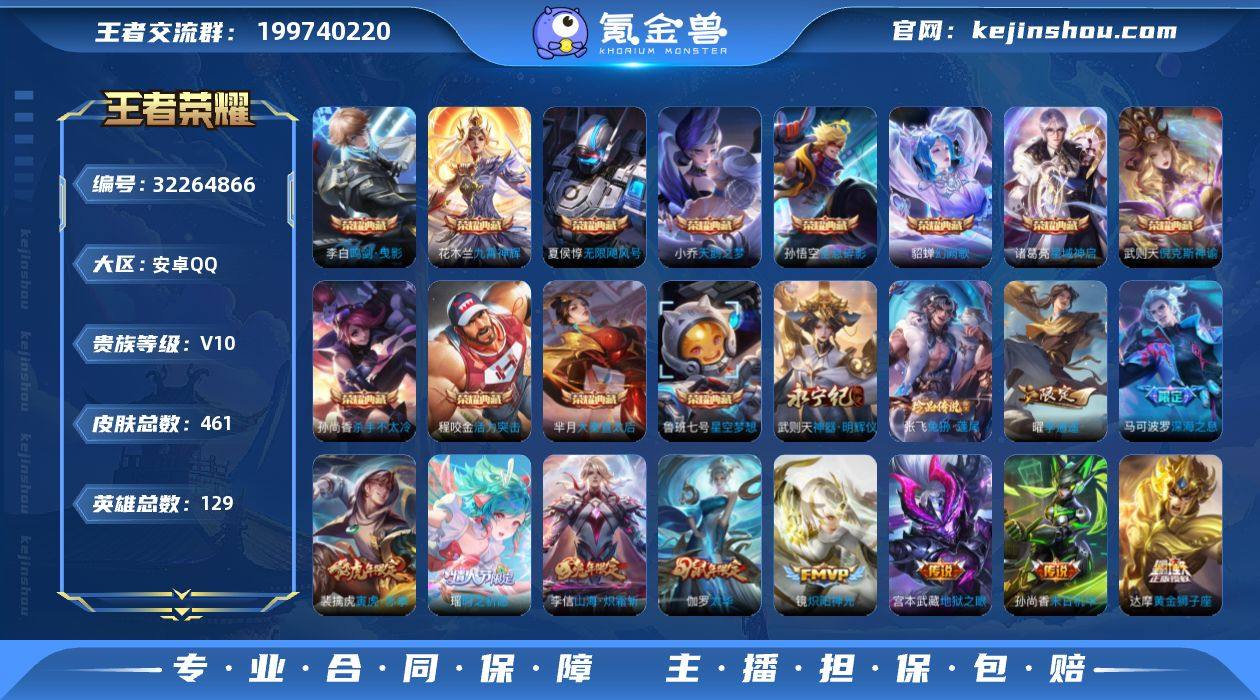 安卓QQ/绝世王者/461皮肤/129英雄/12典藏/0珍品无双/1无双/1珍品传说/58传说/146史诗/10稀有英雄 【1 珍品传说】兔狲·蓬尾 张飞, 【12 典藏皮肤】鸣剑·曳影 李白,全息碎影 孙悟空,杀手不太冷 孙尚香,天鹅之梦 小乔,活力突击 程咬金,倪克斯神谕 武则天,幻阙歌 貂蝉,星空梦想 鲁班七号,无限飓风号 夏侯惇,九霄神辉 花木兰,大秦宣太后 芈月,星域神启 诸葛亮, 【1 无双皮肤】神器·明辉仪 武则天, 【58 传说皮肤】枫霜尽 橘右京,胖达荣荣 梦奇,星穹之声 王昭君,启明星使 虞姬,云霓雀翎 虞姬,前尘镜 娜可露露,无限倾心 虞姬,花朝如约 蔡文姬,碎云 百里守约,时之祈愿 瑶,电玩·雷克斯 澜,飞鸢探春 李元芳,无双飞将 马超,李逍遥 曜,零号·赤焰 孙悟空,地狱火 孙悟空,云鹰飞将 曜,补天 女娲,神器·狴犴令 狄仁杰,深海之息 马可波罗,觅芳踪 艾琳,游龙清影 西施,遇见胡旋 貂蝉,猫影幻舞 貂蝉,仲夏夜之梦 貂蝉,地狱之眼 宫本武藏,海洋之心 武则天,时雨天司 诸葛亮,音你心动 周瑜,炽阳神光 镜,启示之音 露娜,黄金射手座 后羿,无限倾心 项羽,寅虎·瑞焰 鲁班七号,怒海麟威 吕布,乞巧织情 王昭君,时之恋人 刘备,挚爱之约 孙策,黄金狮子座 达摩,绯月行 不知火舞,久胜战神 干将莫邪,末日机甲 孙尚香,异界灵契 孙尚香,末日机甲 孙策,山海·炽霜斩 李信,一念神魔 李信,音你心动 小乔,山海·琳琅生 小乔,淬星耀世 赵云,炽翼辉光 伽罗,太华 伽罗,绛天战甲 铠,挚爱花嫁 大乔,寅虎·赤拳 裴擒虎,超时空战士 狄仁杰,冠军飞将 花木兰,黄金白羊座 张良,神树通天 后羿, 【146 史诗皮肤】龙鼓争鸣 蒙犽,时之奇旅 安琪拉,电玩小子 鲁班七号,末日机甲 吕布,紫霞仙子 露娜,时之奇旅 妲己,高山流水 庄周,匿光追影者 镜,奇遇舞章 艾琳,真爱至上 周瑜,唐三藏 金蝉,暗渊魔法 司马懿,匿光决锋者 夏侯惇,暗影游猎 马可波罗,天秀·音浪 高渐离,苍穹之光 项羽,天...