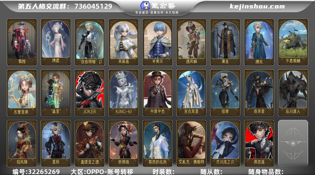 杰克-翦烛,昆虫学者-缚愿,台球手-自由领袖D,“骑士”-辛美尔,气象学家-芙莉莲,哭泣小丑-逐风蜗,隐士-薄金,病患-溯光,蜘蛛-不息载械,祭司-名誉首席,入殓师-“温室”,杂技演员-JOKER,木偶师-KING-h1,勘探员-中原中也,宿伞之魂-亘古双星,梦之女巫-信使,“杰克”-夜来香,“杰克”-忘川渡人,古董商-招风旗,病患-星辰,勘探员-盖提亚之遗,杂技演员-祈雨珠,宿伞之魂-粲然的北辰,“杰克”-艾札克·佛斯特,先知-芥川龙之介,杂技演员-雨宫莲 卖家说:迷雾山庄扎克多金6000回升 看截图,紫薯都换杰克的金皮和金挂了,双真理麒麟商人锁芯
