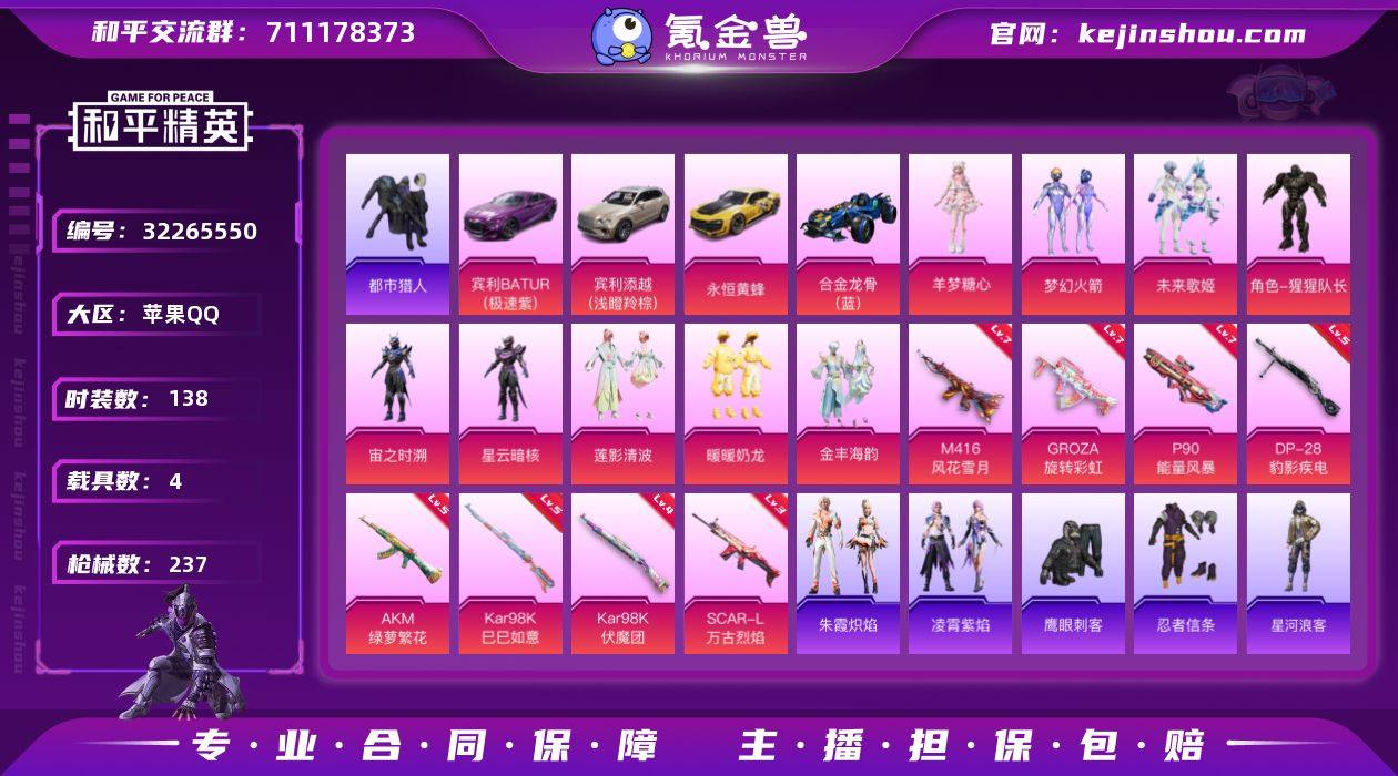 【kyhp1014】苹果 手Q-9粉装-11特效枪-4载具-5粉色飞行器-77210热力值-8王牌印记-138套装-237枪皮 【热门品类】:粉装-梦幻火箭,套装-都市猎人,套装-忍者信条,套装-星河浪客,套装-龟仙人,套装-暗影哥特 【粉色套装】:粉装-梦幻火箭,粉装-未来歌姬,角色-猩猩队长,角色-宙之时溯,角色-星云暗核,粉装-莲影清波,粉装-暖暖奶龙,粉装-金丰海韵,角色-羊梦糖心 【粉色枪皮等级】:AKM-绿萝繁花(五级),SCAR-L-万古烈焰(三级),M416-风花雪月(七级),GROZA-旋转彩虹(七级),ACE32-萌骑漫游(二级),AKS-74U-森灵之息(四级),P90-能量风暴(七级),Kar98K-伏魔团(四级),Kar98K-巳巳如意(五级),Mk14-福马献瑞(五级),DP-28-豹影疾电(五级) 【粉色载具】:宾利BATUR(极速紫),宾利添越(浅瞪羚棕),永恒黄蜂,合金龙骨(蓝),僚机-萌兔起飞 【粉色枪皮】:AKM-绿萝繁花,SCAR-L-万古烈焰,M416-风花雪月,GROZA-旋转彩虹,ACE32-萌骑漫游,AKS-74U-森灵之息,P90-能量风暴,Kar98K-伏魔团,Kar98K-巳巳如意,Mk14-福马献瑞,DP-28-豹影疾电 【粉色飞行器】:梦幻火箭飞行器,歌者泠鸢飞行器,拂晓神骑飞行器,万古烈焰飞行器,踏卷乘风飞行器 【粉色降落伞】:极限特训降落伞,幻影战神降落伞,梦幻火箭降落伞,星之彼岸降落伞,旋转彩虹降落伞,青空秋雨降落伞,启明星降落伞,苔丝玫瑰降落伞,未来歌姬降落伞,闲梦青缨降落伞,万古烈焰降落伞,莲影清波降落伞,镜光幻境降落伞,星梦奇缘降落伞,鬼刀降落伞,灵猫魔法师降落伞,炫彩糖果降落伞,天马神君降落伞,霜月狼主降落伞 【稀有套装】:套装-龟仙人,套装-巳巳如意,套装-马上有钱,套装-雏菊兔兔,套装-萝兰蝴蝶,套装-小熊娃娃,角色-达芬奇,套装-先驱飞行员,套装-糖糖葫芦,套装-青团波波,套装-燕燕于飞,套装-鱼渊荷华,套装-粉恋花,套装-...