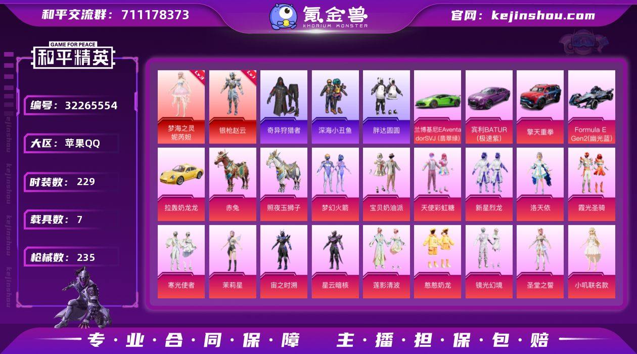 【特价售出】苹果,手Q-2神装-17粉装-10特效枪-7载具-7粉色飞行器-98734热力值-12王牌印记-229套装-235枪皮 【红色神装等级】:梦海之灵-妮芮妲(三级),角色-银枪赵云(一级) 【红色角色神装】:梦海之灵-妮芮妲,角色-银枪赵云 【热门品类】:粉装-梦幻火箭,套装-浪漫天命,套装-深海小丑鱼,套装-小丑鱼,套装-奇异狩猎者,角色-军刀雅典娜,套装-胖达圆圆,角色-忠猛周仓,角色-忠真马岱,角色-忠义严颜,套装-龟仙人,套装-暗影哥特,套装-浪漫波比,套装-粉红小猪,套装-萌熊伴侣,角色-Mark.06,大砍刀-青龙偃月刀,撬棍-龙胆亮银枪 【粉色套装】:粉装-宝贝奶油派,粉装-天使彩虹糖,粉装-梦幻火箭,粉装-新星烈龙,角色-洛天依,粉装-霞光圣骑,粉装-寒光使者,角色-茉莉星,角色-宙之时溯,角色-星云暗核,粉装-莲影清波,粉装-憨憨奶龙,粉装-镜光幻境,角色-圣堂之誓,角色-小叽联名款,角色-星梦奇缘,角色-狂花道·不知火舞 【粉色枪皮等级】:AKM-绿萝繁花(五级),SCAR-L-万古烈焰(三级),SCAR-L-锦绣绵绵(五级),M416-五爪金龙(二级),M416-心之恋语(六级),UMP45-宇宙意志(三级),Kar98K-巳巳如意(三级),M200-梦海之灵(三级),DP-28-圣堂之誓(四级),DP-28-豹影疾电(五级) 【粉色载具】:兰博基尼Aventador SVJ(翡翠绿),宾利BATUR(极速紫),擎天重拳,Formula E Gen2(幽光蓝),拉轰奶龙龙,赤兔,照夜玉狮子 【粉色枪皮】:AKM-绿萝繁花,SCAR-L-万古烈焰,SCAR-L-锦绣绵绵,M416-五爪金龙,M416-心之恋语,UMP45-宇宙意志,Kar98K-巳巳如意,M200-梦海之灵,DP-28-圣堂之誓,DP-28-豹影疾电 【粉色飞行器】:梦幻火箭飞行器,歌者泠鸢飞行器,万古烈焰飞行器,镜光幻境飞行翼,幻海精灵飞行器,深渊漩涡飞行器,曦光华影飞行器 【粉色降落伞】:甜心宝贝降落伞,至尊龙雀降落伞,春暖花开...