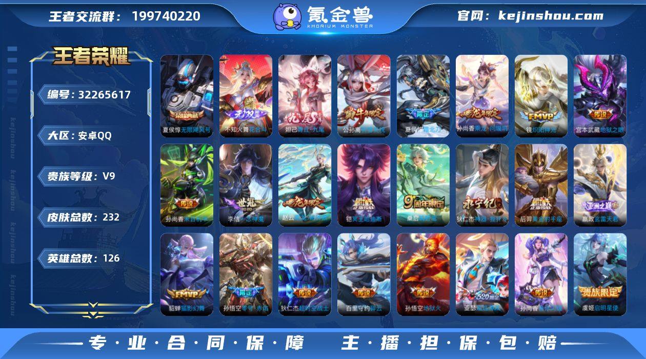 【秒换绑】安卓Q-V9-尊贵铂金IV段位-126英雄-232皮肤-1典藏皮肤-2无双-22传说-61史诗 【英雄全皮】:影全皮 【荣耀典藏】:夏侯惇无限飓风号 【无双皮肤】:不知火舞花合斗,妲己青丘九尾 【传说皮肤】:嬴政玄雷天君,桑启鸣野蒿,夏侯惇霜北刀,铠冥王哈迪斯,孙尚香乘龙问璇玑,赵云乘龙铭钟鼎,亚瑟追逃游戏,狄仁杰神器狴犴令,百里守约碎云,孙尚香音你闪耀,公孙离祈雪灵祝,铠绛天战甲,镜炽阳神光,虞姬启明星使,孙悟空零号赤焰,李信一念神魔,貂蝉猫影幻舞,后羿黄金射手座,孙尚香末日机甲,宫本武藏地狱之眼,孙悟空地狱火,狄仁杰超时空战士 【限定皮肤】:夏侯惇霜北刀,铠冥王哈迪斯,暃埋骨钱,蔡文姬夏日便利店,大乔绒语心约,虞姬夏日便利店,姜子牙天穹之誓,狄仁杰阴阳师,赵云皇家上将,赵云龙胆,赵云百木心枪,孙尚香蔷薇恋人,庄周高山流水,阿轲迷踪丽影,芈月白晶晶,芈月幻夜卜梦,吕布御风骁将,元歌云间偶戏,典韦岱宗,马可波罗暗影游猎,狄仁杰魔术师,狄仁杰万华元夜,狄仁杰神器狴犴令,达摩沙漠行僧,项羽海滩派对,老夫子醍醐杖,安琪拉魔法小厨娘,程咬金演武夺筹,刘邦夺宝奇兵,兰陵王金庭之子,亚瑟潮玩骑士王,亚瑟追逃游戏,孙悟空大圣娶亲,孙悟空零号赤焰,张飞虎魄,李元芳银河之约,李元芳云中旅人,虞姬启明星使,钟馗驱傩正仪,杨戬潮玩骑兵,雅典娜单词大作战,蔡文姬繁星吟游,鬼谷子原初探秘者,鬼谷子五谷丰年,黄忠火炮绅士,铠青龙志,苏烈千军破阵,弈星混沌棋,公孙离祈雪灵祝,沈梦溪星空之诺,沈梦溪大漠名商,明世隐疑决卦,裴擒虎李小龙,裴擒虎擒涛扼浪,云中君纤云弄巧,云中君时之祈愿,猪八戒西部大镖客,蒙犽狂想玩偶喵,鬼谷子天穹祈灯,孙尚香乘龙问璇玑,赵云乘龙铭钟鼎,周瑜熔金海岸,不知火舞花合斗 【年限皮肤】:铠青龙志,典韦岱宗...