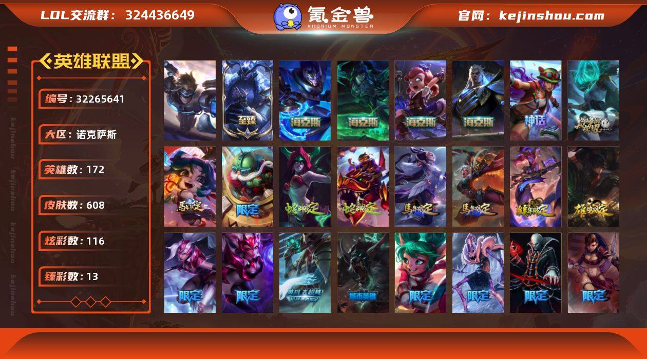t37690【诺克萨斯】608皮肤 116炫彩 13臻彩 10神话/109限定/50传说/172英雄 账号等级:1593 单双排段位:黄金 【重要头像】救生圈 沐浴震惊 美猴王孙悟空 此志无双羽饰骑士 【重要皮肤】DRX亚托克斯至臻 殿堂传奇乐芙兰 海克斯科技安妮 海克斯科技斯维因 海克斯科技嘉文四世 摄魂使者薇恩 胜利行刑官德莱文 胜利剑圣易 胜利女神娑娜 胜利之王泰达米尔 胜利巨口克格莫 冰原狙击凯特琳 钢铁军团拉克丝 荣誉使者玛尔扎哈 安妮梦游仙境 电玩女神厄运小姐 电玩勇者锐雯 玉剑传说舞龙卫 银龙裁决泰隆 天龙之子斯莫德 替父从军花木兰 碧玉之牙卡西奥佩娅 古琴余韵娑娜 定海神珍孙悟空 玉净夜叉凯特琳 广寒仙子嫦娥 虎痴之拳蔚 神龙之翼库奇 龙马烈焰波比 胜利机器人布里茨 胜利女神奥莉安娜 胜利枪神格雷福斯 胜利枪神卢锡安 胜利之剑亚托克斯 甜心宝贝安妮 觅心猎手薇恩 冰雪风暴希维尔 冰雪女神辛德拉 魄罗骑士瑟庄妮 平安夜女神娑娜 圣诞糖果棒厄运小姐 魅惑女巫迦娜 灵魂收割者索拉卡 泳池派对格雷福斯 泳池派对李青 泳池派对雷克顿 电玩战魂赫卡里姆 FPX普朗克 iG卡莎 SKTT1辛德拉 SKTT1瑞兹 SSW锤石 SSW雷恩加尔 SSW图奇 SSW辛吉德 SKTT1贾克斯 SKTT1劫 SKTT1婕拉 SKTT1李青 暗杀星奥莉安娜 暗杀星蒙多 暗杀星努努和威朗普 暗杀星伊泽瑞尔 暗杀星慎 Fnatic迦娜 Fnatic古拉加斯 Fnatic卡尔萨斯 冰雪节玛尔扎哈 冰雪节辛吉德 防暴士兵辛吉德 防暴天使凯尔 钢铁之翼艾尼维亚 冠军之矛卡莉丝塔 冠军之刃锐雯 冠军之刃锐雯2016 鬼影森森茂凯 鬼影重重魔腾 海贼瑞兹 红桃杰克崔斯特 胡桃夹子萨科 惊悚派对阿木木 惊悚派对费德提克 警用试作体K9内瑟斯 蓝色忧郁崔斯特 蒙多蒙多 密林猎手提莫 南瓜头费德提克 女猎手希维尔...