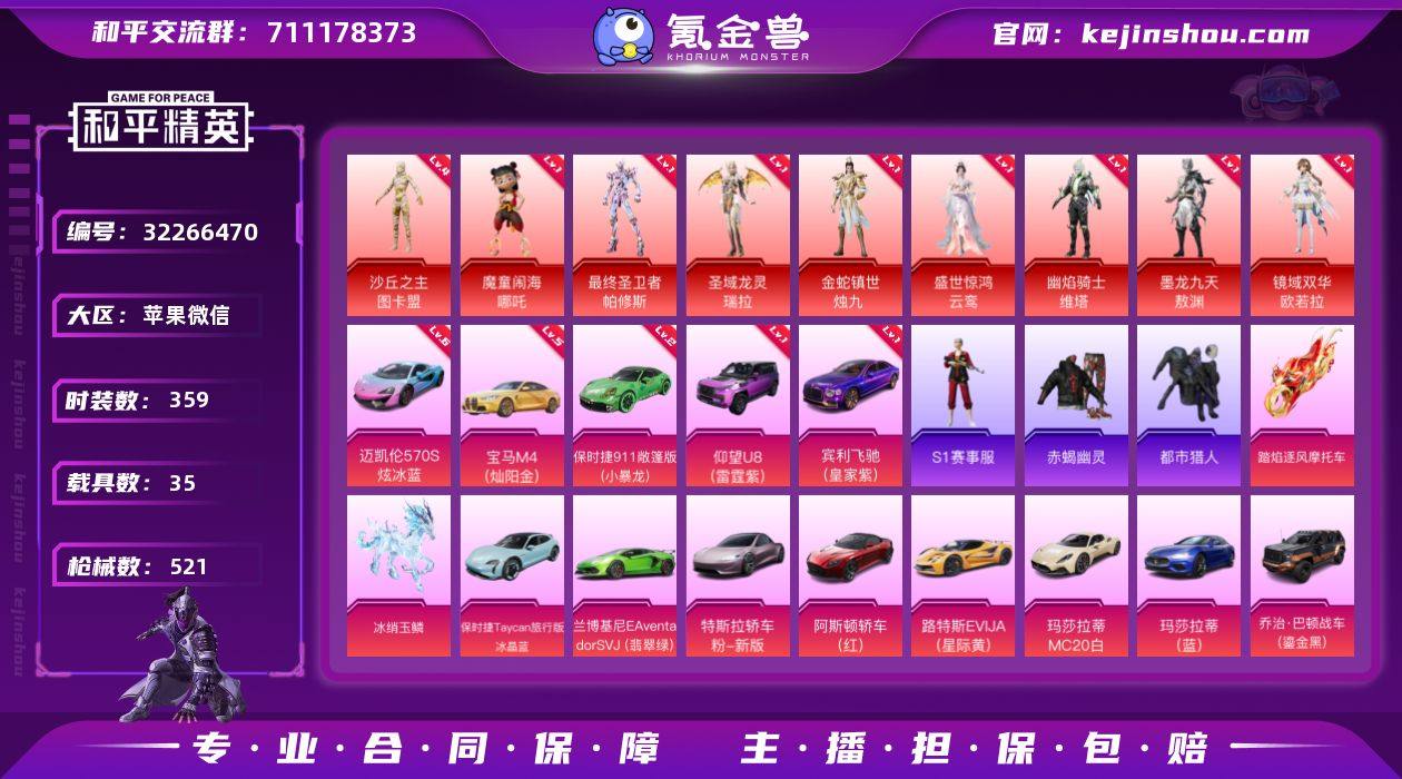 苹果 微信-9神装-45粉装-46特效枪-35载具-32粉色飞行器-265148热力值-32王牌印记-359套装-521枪皮 【红色载具】:迈凯伦570S(炫冰蓝)(六级),宾利飞驰(皇家紫)(一级),仰望U8(雷霆紫)(一级),宝马M4(灿阳金)(五级),保时捷911 敞篷版(小暴龙)(二级) 【红色神装等级】:魔童闹海-哪吒(一级),最终圣卫者-帕修斯(一级),圣域龙灵-瑞拉(一级),金蛇镇世-烛九(一级),盛世惊鸿-云鸾(一级),幽焰骑士-维塔(一级),墨龙九天-敖渊(一级),镜域双华-欧若拉(一级),沙丘之主-图卡盟(四级) 【红色角色神装】:魔童闹海-哪吒,最终圣卫者-帕修斯,圣域龙灵-瑞拉,金蛇镇世-烛九,盛世惊鸿-云鸾,幽焰骑士-维塔,墨龙九天-敖渊,镜域双华-欧若拉,沙丘之主-图卡盟 【热门品类】:粉装-梦幻火箭,粉装-童趣迷兔,粉装-音爆索尼克,粉装-缤纷油彩,套装-S1赛事,套装-赤蝎幽灵,套装-都市猎人,套装-小丑鱼,角色-忠真马岱,套装-龟仙人,套装-粉红小猪,大砍刀-青龙偃月刀,撬棍-龙胆亮银枪 【粉色套装】:粉装-甜心巧克力,粉装-宝贝奶油派,粉装-天使彩虹糖,粉装-梦幻火箭,粉装-金属狂野,粉装-缤纷油彩,粉装-新星烈龙,粉装-极致幻想,粉装-迷蝶贵族,粉装-绚金战神,粉装-...